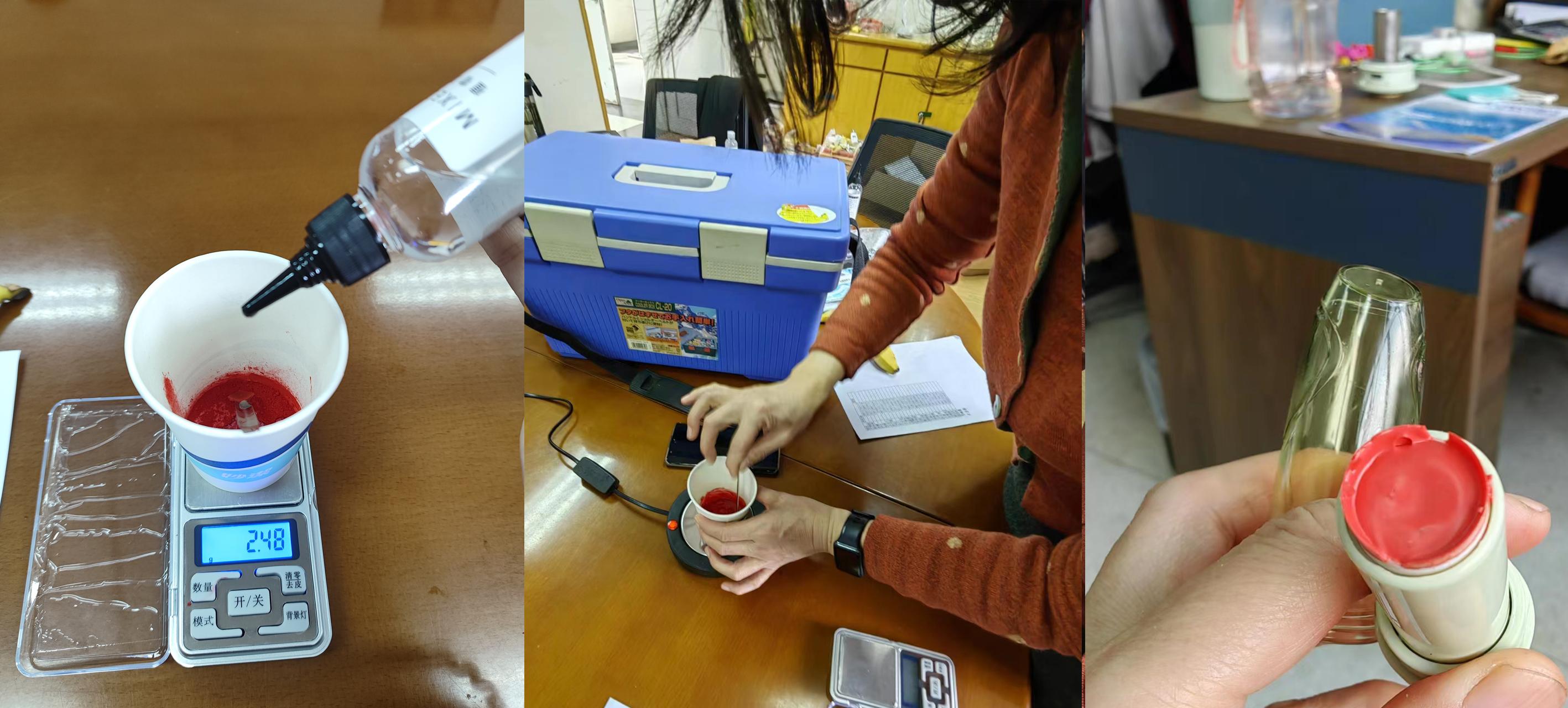 为了快速冷却,这次口红量比较少,不过成品口红香喷喷、油润润,又是自己做的,很有成就感。不少老师说这次活动打开了一扇门,让她们了解到自制口红的方法。有些老师说准备回去后再尝试多做几管自己喜爱的口红。
