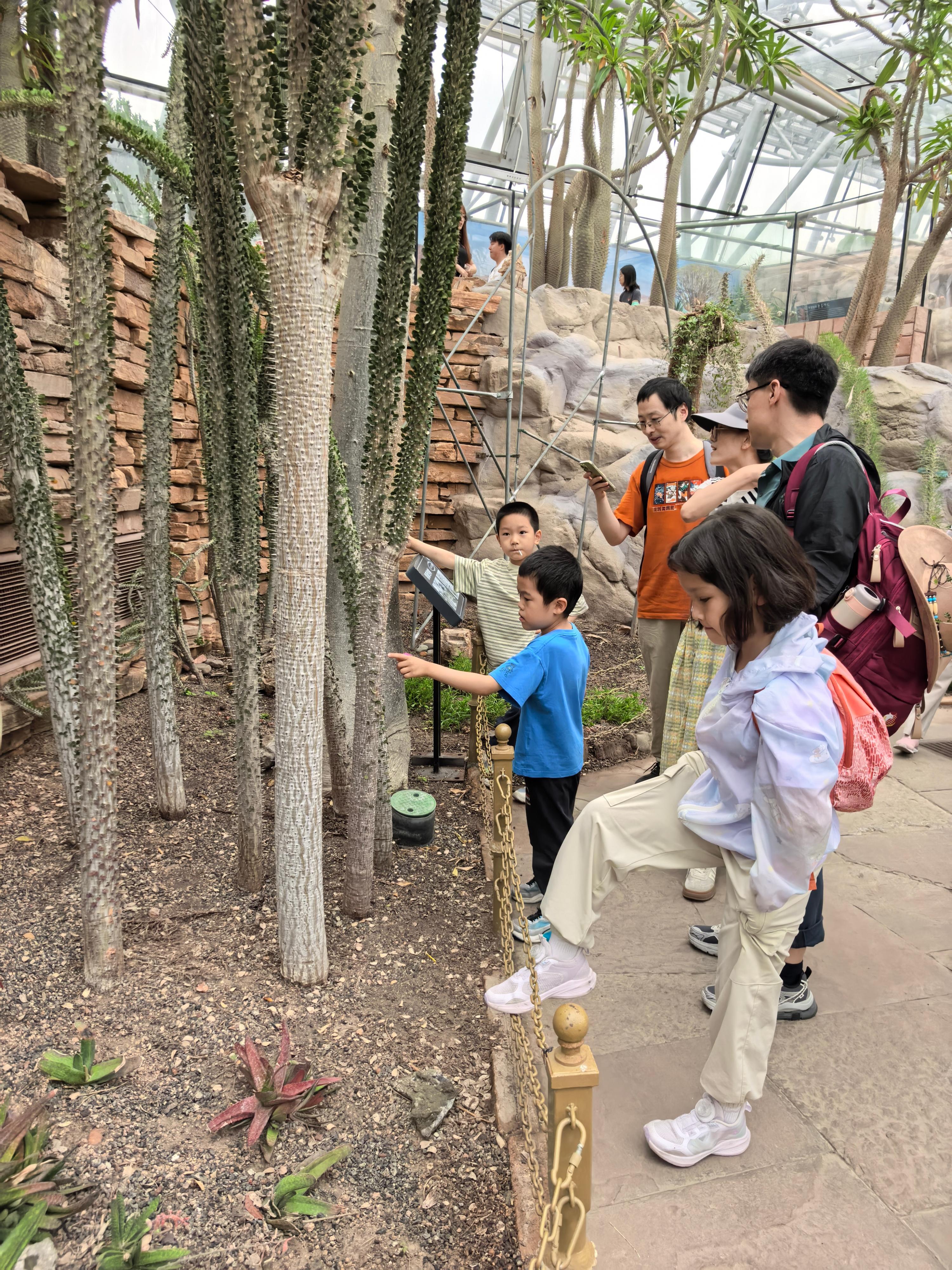 今天植物园温室的通票是六岁以下的小朋友不仅自己免票,还可以带一位家长进入,这真的是意外之喜,是六一的特殊福利了。温室里面的管道时不时会喷洒水汽,让温室云雾萦绕,仿佛仙境。温室里有很多热带的奇花异草,里面还有多层,高高低低的植物错落有致。大家在这里逗留了很久欣赏着热带风光。
