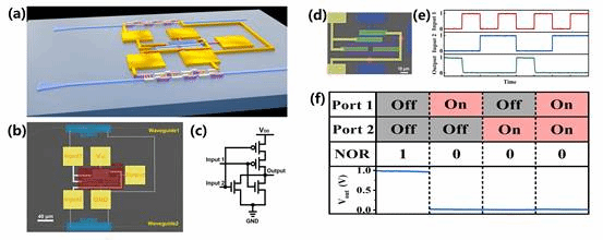 课题组借助碳纳米管器件工艺与硅基工艺之间良好的兼容性,制备碳纳米管红外光探测器和CMOS逻辑电路。通过耦合碳管红外光探测器与硅基单模波导,吸收材料与光子的相互作用大大增强,探测器的光电流响应度相比正入射下提升了97.6倍,达到了12.4 mA/W;同时,通过开发“蛇形”光伏倍增二极管结构,波导耦合的光电二极管可显现线性光伏倍增,输出电压信号与逻辑门的供电电压匹配,做到逻辑控制。由此看来,波导耦合光探测器的输出电压信号可被用来作为CMOS反相器、或非门等碳管器件的逻辑输出电平,可通过逻辑电路对光逻辑信号进行数据处理。多根波导、多个光探测器和逻辑门的集成展示也体现出碳管光电集成系统在兼容波分复用技术方面一定的潜力,有望提升光电集成系统数据承载能力。