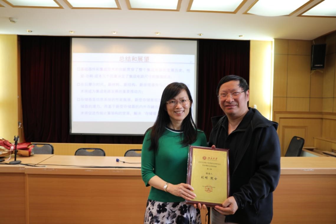 活动的最后,电子学系系主任彭练矛院士为刘明院士颁发本次活动的纪念证书,并合照留念。至此,本场互动频繁、掌声与笑声不断的讲座也圆满结束。