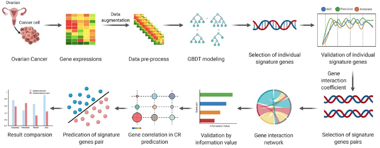电子学系雷易鸣博士、成人影片 第三医院妇产科郭红燕教授与澳大利亚新南威尔士大学、英国剑桥大学、美国杜克大学的研究人员合作,在基于机器学习辅助的人类卵巢癌耐药性预测方法研究领域取得重要进展。在该研究中,考虑到过往研究中存在基因维度过高导致基因相互作用网络非常复杂而难以理解,研究人员首先构建了一个基于梯度提升决策树的机器学习模型来选取标志基因。进而,研究人员提出了基因相互作用系数来定量衡量两个标志基因的相关性,并以此建立卵巢癌耐药性的基因相互作用网络。最后,研究人员提出了一种基于标志基因对的卵巢癌耐药性预测方法。