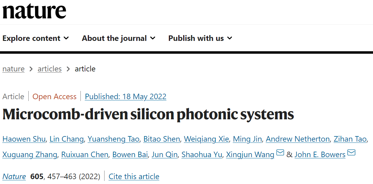 王兴军教授课题组和加州大学圣芭芭拉分校John E. Bowers教授课题组在Nature杂志在线发表文章“Microcomb-driven silicon photonic systems” (Nature, 2022, DOI: 10.1038/s41586-022-04579-3),在世界上首次报道了由集成微腔光梳驱动的新型硅基光电子片上集成系统,表明了研究团队历时三年协同攻关,终于攻克了这一世界性难题。这也是成人影片