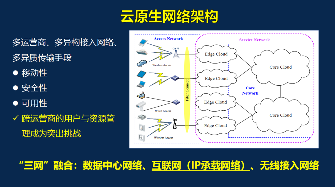 为解决上述问题,于全院士团队提出了云原生网络架构,以核心云和边缘云来构建骨干网,设备通过接入边缘云来接入网络。其核心思想是基于云而不是路由器来构建网络,网络主要解决的是云服务问题,其主要功能变成了云边端的智能协作。针对边缘侧的多运营商、多异构接入、多异质传输带来的移动性、安全性和传输可靠性的挑战,该成果提出了基于网络孪生的云原生网络架构。