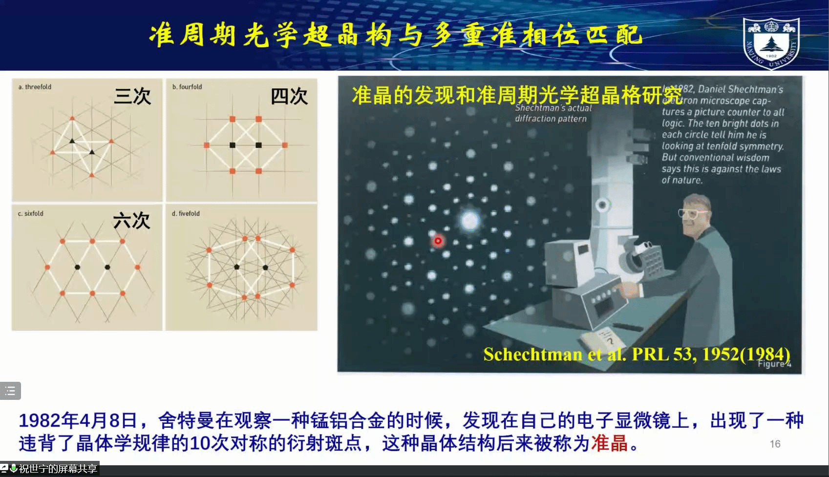 接下来,祝院士介绍了准周期光学超晶构与多重准相位匹配。1982年,舍特曼发现了具有五次对称性的准晶结构,这是一种三维空间的Penrose拼图结构,是六维空间周期结构在三维空间的投影。利用这样的准周期超晶格结构可以满足更多的准相位匹配条件。1997年,南京大学结合图案极化技术,实现了准周期光学超晶格的制备,实现高效的激光三倍频。进一步地,南京大学还利用图案极化技术制备准周期光学超晶格的方法,实现了中红外激光的稳定输出,并且具有窄线宽、可调谐的特性。类似的,也可以利用光学超晶格实现频率梳的制作。这样的中红外激光在安全、科研中都有广泛的应用。