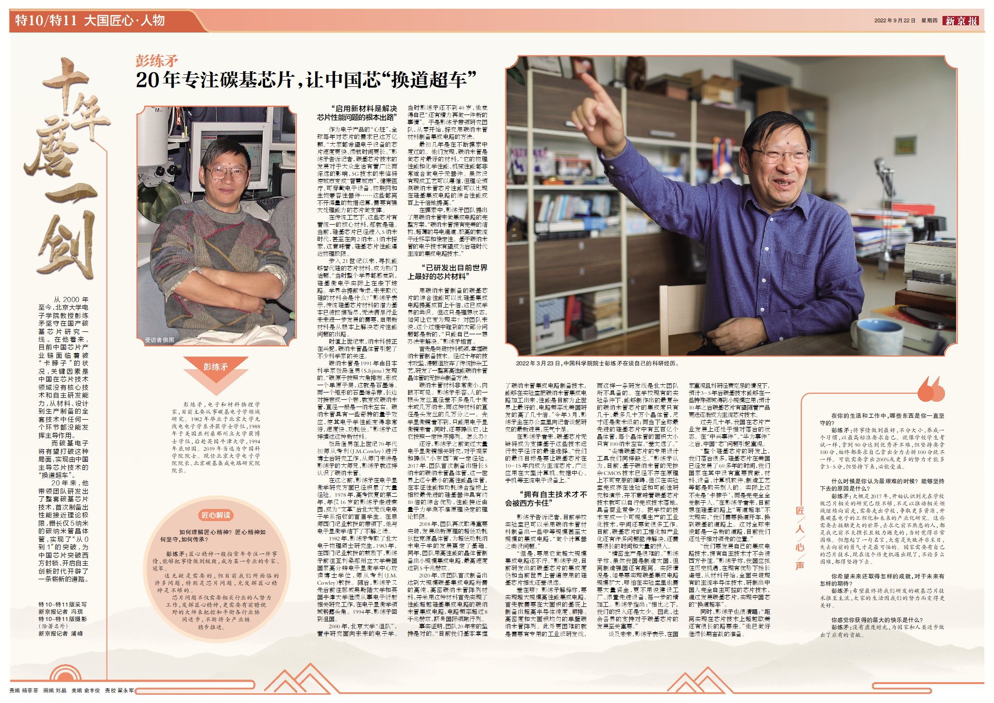 原文链接:院士彭练矛:20年坚守碳基芯片研发,让中国芯“换道超车”(《新京报》2022年9月22日 大国匠心特刊《十年磨一剑》)