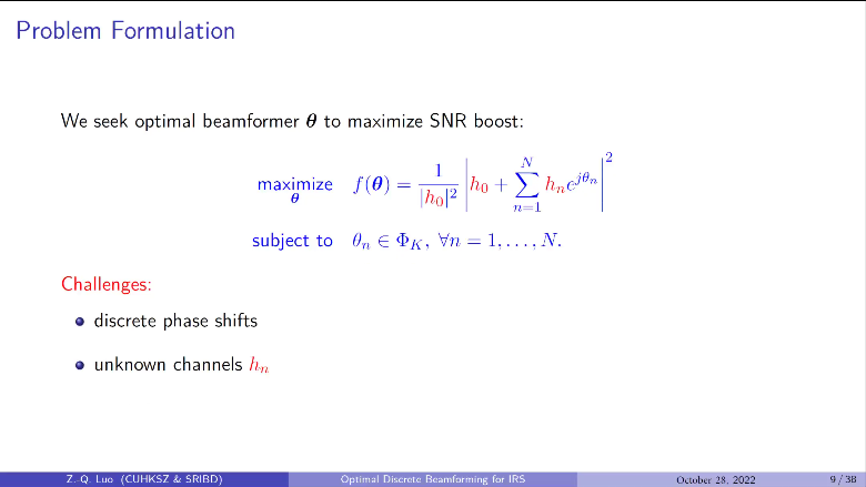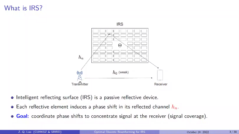 讲座开始时,罗院士介绍了智能反射表面(Intelligent Reflection Surface, IRS)的工作原理以及优化问题的建模。智能反射表面是一种无源反射器件,表面的每个反射单元在其信道上引入一个相移。通过协调所有反射单元的相移,将发射端发来的入射信号反射到接收方,可实现定向信号增强,从而提高无线通信网络的性能。因此,如何控制反射单元的相移,以最大化传输信噪比的提升,成为了其中关键的优化问题。
