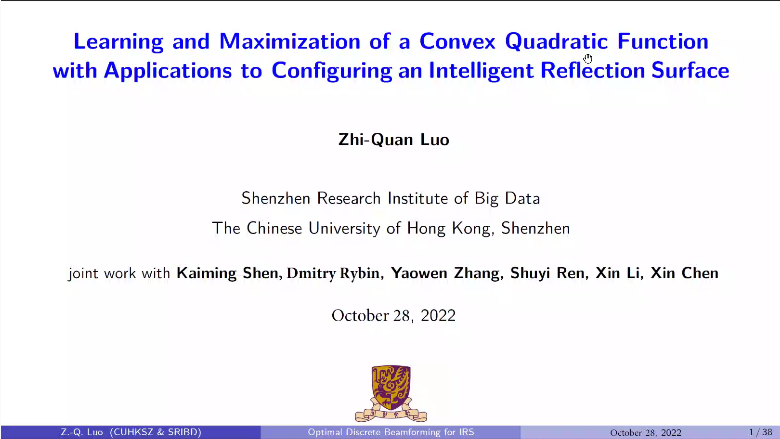 前沿学术论坛第38期讲座通过网络成功举办。香港中文大学(深圳)副校长罗智泉院士以“凸二次函数最大化问题的求解及其在无线智能反射表面中的应用”为主题进行了精彩演讲。本次报告由成人影片