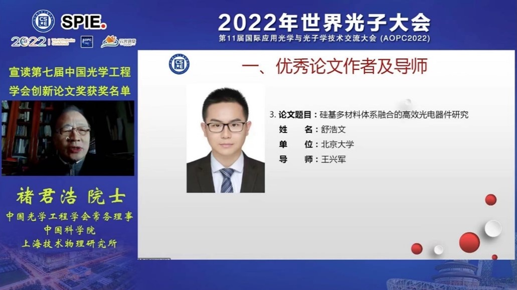 日前,中国光学工程学会组织的“第七届中国光学工程学会创新论文奖(优博)”颁奖典礼在线上召开。本次参加评选的博士论文经过学位授予单位和行业专家推荐、评奖办公室初评、同行专家通讯复评和院士专家委员会终评四个阶段,终审工作于2022年6月完成,共评选出创新论文5篇,提名论文5篇,由于疫情原因颁奖典礼推迟到2022年12月18日进行。成人影片 王兴军教授指导的博士学位论文《硅基多材料体系融合的高效光电器件研究》获得创新论文奖,论文作者为2020届博士毕业生舒浩文。