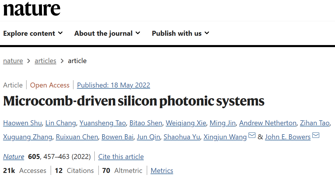 这一年,我们聚焦世界科技前沿,服务国家重大战略需求,学科建设水平进一步加强,科研工作喜报频传。电子科学与技术、信息与通信工程两个一级学科在学科评估中突出重围,再创佳绩。本年度牵头承担多项国家重大科研任务,新增科技部重大专项2项(中央财政经费:2.4亿元)、国家重点研发计划项目4项(常规2项,青年2项)、国家自然科学基金项目17项(杰青2项,重点2项),到账科研经费突破5.1亿元,创历史新高。平台建设取得新突破,新增国家级重点实验室1个。国际学术影响力稳步提升,以第一单位在Nature或Science期刊(含子刊)发表论文4篇,其中Nature正刊1篇,Nature子刊2篇,Science子刊1篇。6名教师入围爱思唯尔2021“中国高被引学者”。科技创新能力持续增强,科研成果丰硕喜人。宋令阳团队致力于无线通信技术研究,1项成果获2021年度中国电子学会科学技术一等奖(2022年公布)。王兴军-常林团队在世界首次报道了由集成微腔光梳驱动的新型硅基光电子片上集成系统,为下一代片上光电子信息系统提供了全新的研究范式和发展方向。彭练矛-张志勇带领的碳基团队以碳纳米管网络薄膜为半导体材料,构建了包含柔性传感器、传感界面电路和存储阵列的集成表皮电子系统。陈徐宗-周小计团队与合作者历时11年研制的超冷原子柜于今年搭乘梦天实验舱进入太空,开启超冷原子物理科学实验。
