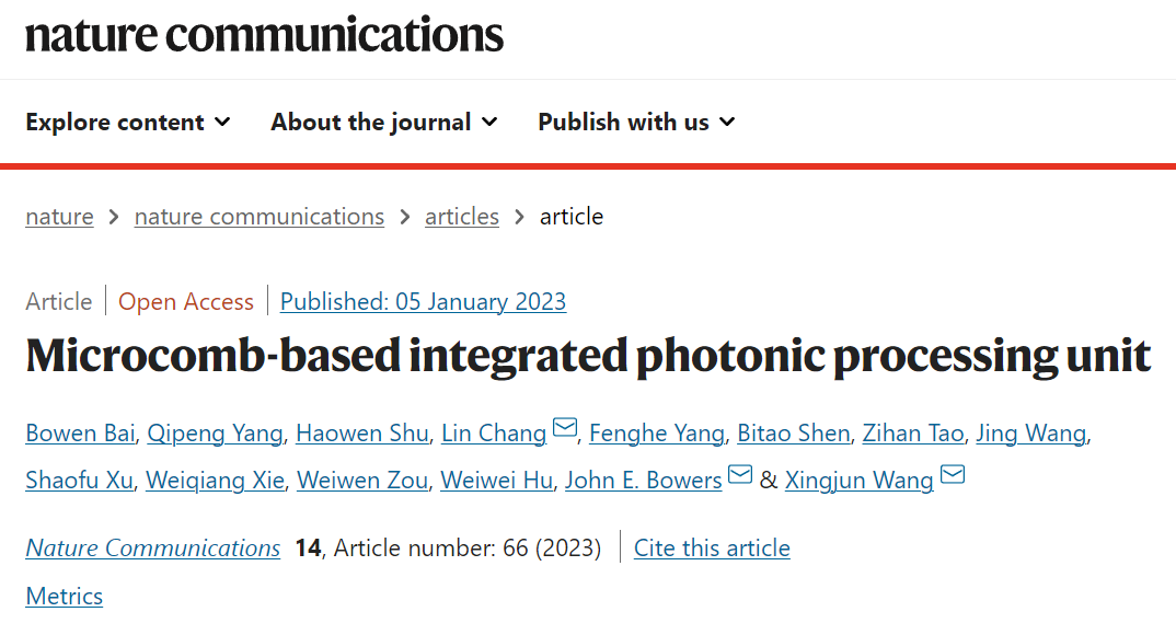 王兴军课题组-常林课题组在Nature Communications杂志在线发表文章“Microcomb-based integrated photonic processing unit”。文章首次报道了一种基于光子神经网络的超高算力密度硅基集成光子处理器。研究团队历时3年,攻克了多波长并行光计算系统校准和超高精度权重加载两个世界性技术难题。