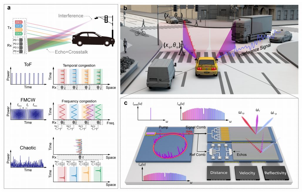 王兴军教授课题组-常林研究员课题组在两年攻关的基础上,研制出一种全新的硅基片上多通道混沌光源,提出了一种基于混沌光梳的并行激光雷达架构,攻克了激光雷达抗干扰和高精度并行探测这两个世界性难题,保证高性能高安全的同时,极大降低未来激光雷达系统体积、复杂度、功耗和成本。