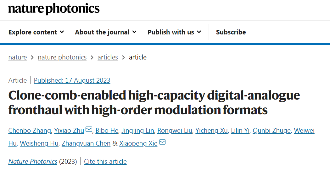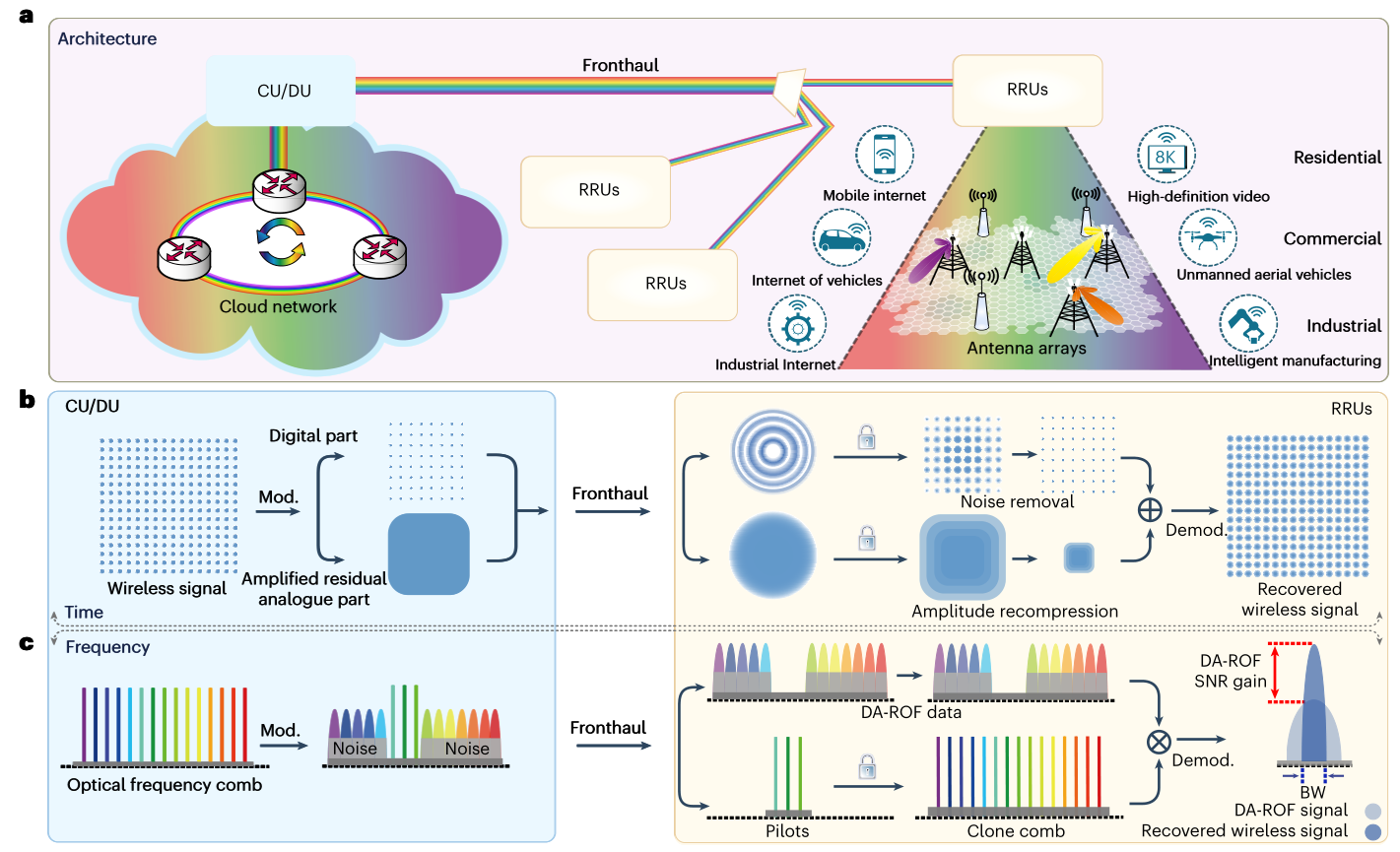 微波光子团队与上海交通大学电子工程系新型光网络研究团队合作,针对后5G时代光载无线接入网容量和信噪比受限的挑战,创造性地提出了基于克隆光梳的数字模拟混合前传接入架构,成功实现了超大容量和超高制式的无线信号前传接入。2023年8月17日,相关研究成果以“克隆光梳赋能大容量高调制格式数字模拟前传”(Clone-comb-enabled high-capacity digital-analogue fronthaul with high-order modulation formats)为题,在线发表于《自然·光子学》(Nature Photonics)。