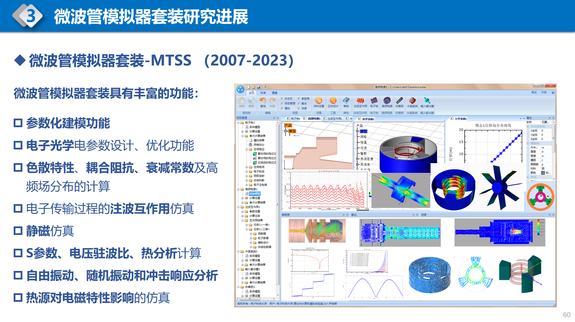 行波管是一种最具代表性的真空电子器件,单一器件包含有电子枪、高频系统、磁聚焦系统、收集极等多个部件。行波管运作过程包含大量复杂物理过程,主要包括电子注的发射、成型、聚焦、传输和收集过程,电磁波在复杂高频慢波结构中的本征和传输问题,高频慢波系统中高能电子注与电磁波的强非线性相互作用问题,因此针对行波管的模拟和设计,开发一套高精度的电磁仿真软件是非常艰巨的任务。团队自1994年以来,对行波管中涉及的计算电磁学算法进行了系统性研究,提出了自适应网格技术、时域轨迹计算方法、3D局部对称计算方法、改进的隐式重启Arnoldi本征分析方法、去除伪直流模式的新方法、非匹配网格旋转周期边界施加技术、基于逆的多波前块ILU预处理技术,以及建立了行波管全三维多信号非线性注波互作用理论模型,基于这些新算法和新模型,自主研发了我国第一套具有自主知识产权的行波管三维仿真设计软件,软件计算精度毫不逊色于商用软件,且计算时间大大缩短,计算内存也大大减少。微波管模拟器套装(MTSS)的全三维版本2007年以来就开始在我国电真空行业推广应用,目前已成为我国电真空行业的核心设计软件。当前,我国自主研制的行波管90%以上都是基于MTSS设计完成。