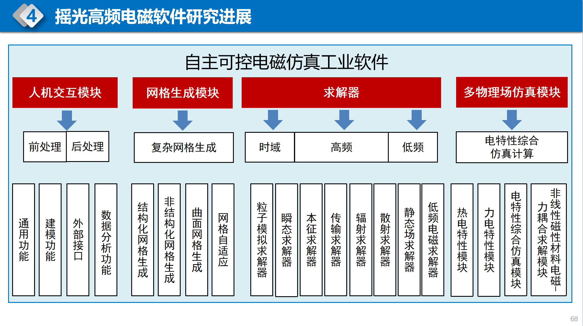 据调查,目前国内95%以上的相关电磁模拟软件依赖于进口,对国家安全构成极大威胁。为解决这一问题,李斌教授和他的团队着力进行科技攻关,致力于开发自主可控的综合性电磁仿真工业软件。李教授详细介绍了团队在前述真空电子学专用领域的计算电磁学算法和软件的工作基础上,将该专用MTSS软件,拓展到通用的面向复杂电子装备的电磁综合特性仿真设计软件方面的工作,重点介绍了其中的FEM算法及基于该算法的摇光高频电磁软件的研究进展。团队提出并发展了基于无限元法的高效截断方法,基于高阶传输条件的非共形区域分解法,有限阵列区域分解,基于有限元边界积分法的精确高效区域截断技术,“网格级”精确求解技术等系列新方法新技术,并研发成功摇光高频电磁软件,该软件已开始在国内航天、航空、电子、船舶、兵器等行业相关研究所推广应用。