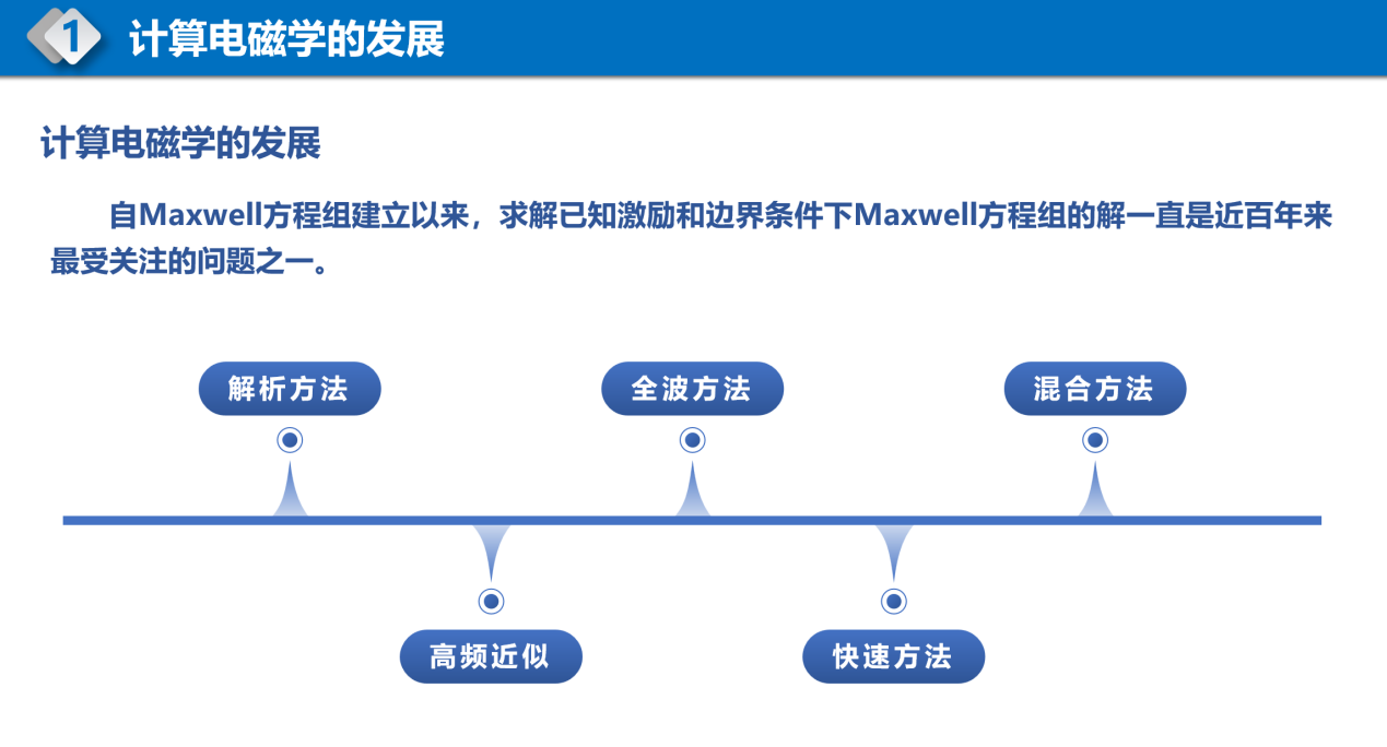 在本次讲座中李斌教授介绍和分享了目前计算电磁学广泛应用的几种计算方法以及团队研发的三维仿真设计工业软件的核心原理。李教授首先介绍了计算电磁学的发展历程。麦克斯韦方程组的提出为电磁学研究提供了理论基础和框架。该理论的出现极大地推动了电磁学的发展,并为后来的科学和技术进步奠定了基础,计算电磁学也由此得到了广泛的发展和重视。