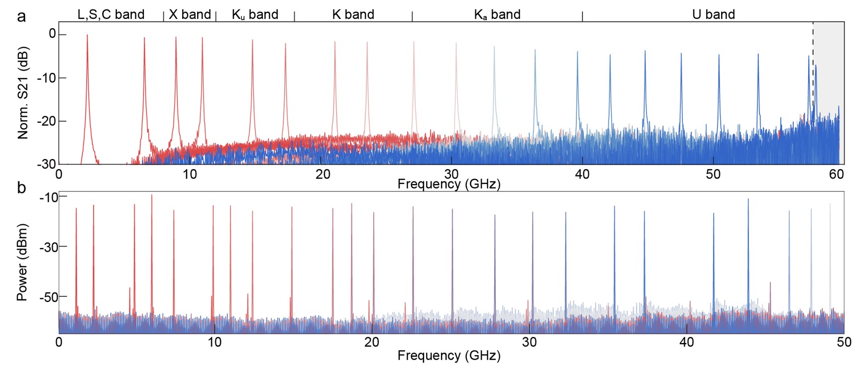 研究团队验证了在光子分子开启状态下可实现谐振峰劈裂的灵活调控,仅利用芯片上的热电极即可实现两个模式耦合强度以及相位差的调谐,实现了劈裂不同维度的变化。而当光子分子处于关闭状态时,基模又可以实现在环内零串扰、低损耗传输,并且由于微环弯曲波导的尺寸极小,微环同时具有极大的FSR和极高的Q值,研究团队验证了该微环作为微波光子链路中的关键部件,能够在超宽频谱内提供极其精细的滤波功能。基于该微环的微波光子滤波器能够在L, S, C band至U band范围内实现高达58 GHz的连续调谐能力,其3 dB滤波线宽最窄仅32 MHz。团队还借助该微环成功完成了光电振荡器(OEO)的实验验证,实现了中心频率从sub-6G到50 GHz的可调谐微波源。这种滤波器和OEO代表了目前国际上基于硅基集成器件所实现的最宽频段和最精细纵模滤波的水平。