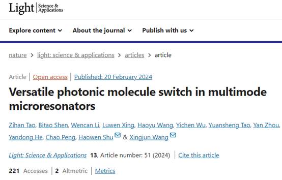 论文信息:Tao, Z., Shen, B., Li, W. et al. Versatile photonic molecule switch in multimode microresonators. Light Sci Appl 13, 51 (2024). //doi.org/10.1038/s41377-024-01399-0