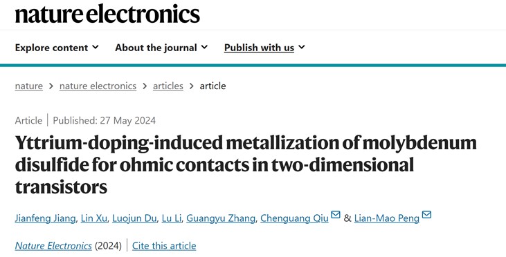 彭练矛院士-邱晨光研究员课题组在二维半导体集成工艺方面提出了“稀土钇元素诱导相变理论”,并发明了“原子级精准选区掺杂技术”,突破了传统离子注入掺杂结深无法小于5纳米的工程限制,首次将源漏选区的掺杂深度推进到单原子层0.5纳米极限,并基于二维半导体晶圆规模化制备出超短沟道弹道晶体管,实现了理想的欧姆接触和开关特性,有潜力构建未来更高性能、更低功耗的亚1纳米技术节点芯片。相关研究成果以“Yttruim-doping-induced metallization of molybdenum disulfide for ohmic contacts in two-dimensional transistors”为题,2024年5月27日在线发表于《自然·电子学》(Nature Electronics,原文链接://www.nature.com/articles/s41928-024-01176-2)。姜建峰博士与徐琳博士为共同第一作者,邱晨光研究员和彭练矛院士为共同通讯作者,成人影片