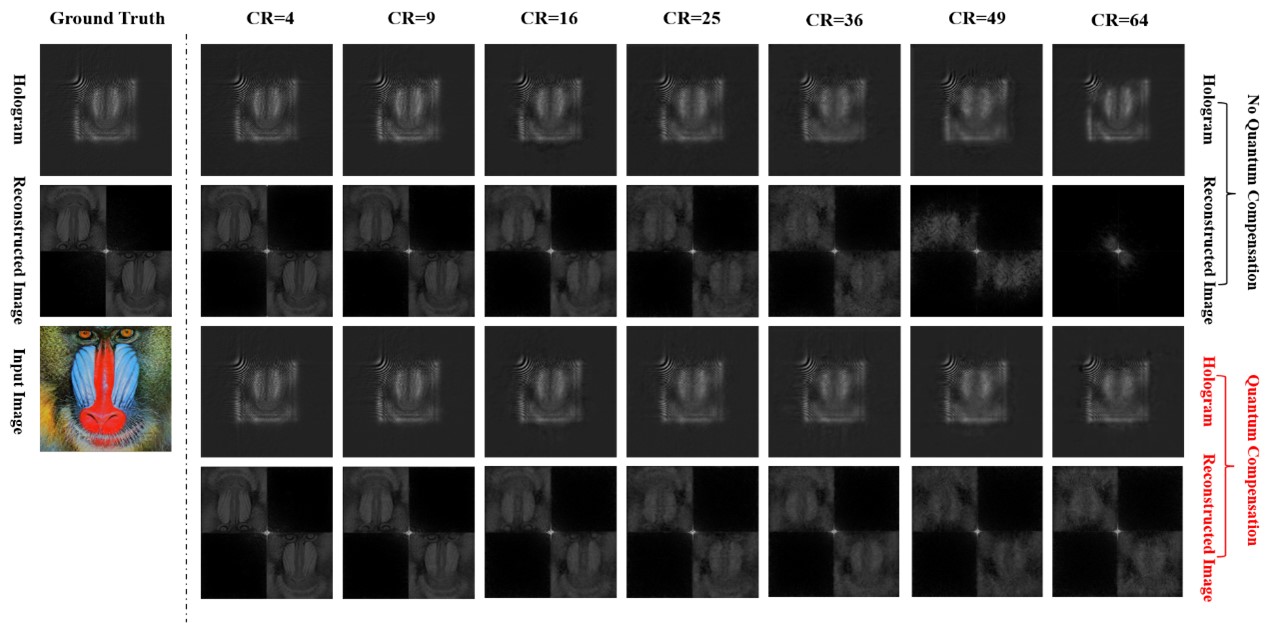三维图像显示技术在人们的日常生活中扮演着越来越重要的角色。全息显示技术可以重建三维空间下的整个光波场,并且可以提供人眼可以感知到的三维场景所有的深度信息。其中,计算机生成全息图相比传统的光学全息图,可以记录一些现实中不存在虚拟物体而且制作更加便捷。计算机生成全息是一种将三维物体场景转换为二维复值全息图的技术,包含了大量的原始物体的振幅和相位信息,研究探索一种快速压缩和传输计算全息图的方法是十分有意义的,同时也是实现电子全息三维图像实时显示的重要环节,为了解决大信息量的快速传输问题,本课题组提出了基于量子补偿混合神经网络的针对计算机生成全息图的压缩与传输的系统方案。该系统包括全息图的计算生成与再现、量子补偿的神经网络的压缩与解压缩、压缩数据流的编码与解码。通过设计量子补偿的混合神经网络结构,实现在尽可能增大全息图压缩倍率的情况下,减少全息图再现恢复的原始物体信息的失真,从而整体上提高全息图恢复的质量,以实现全息三维信息的快速传输。实验结果表明,在菲涅尔离轴计算机全息图数据集上,基于量子补偿混合神经网络的全息图压缩传输系统方案相比传统的神经网络传输方案比较,在绝大多数压缩比下的全息图重建图像质量更高,且随着压缩比增大,量子补偿的恢复效果相比传统模型更加明显。同时,我们发现量子补偿能够辅助经典神经网络在更少的训练轮次下完成收敛。因此,该方法有较大的研究意义和应用潜力。