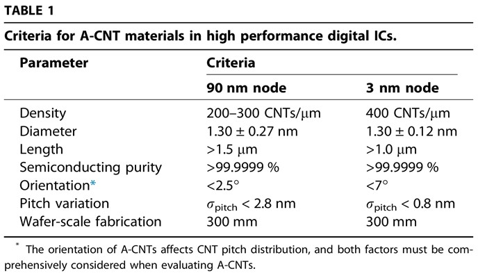 表1:高性能集成电路用阵列碳纳米管材料标准