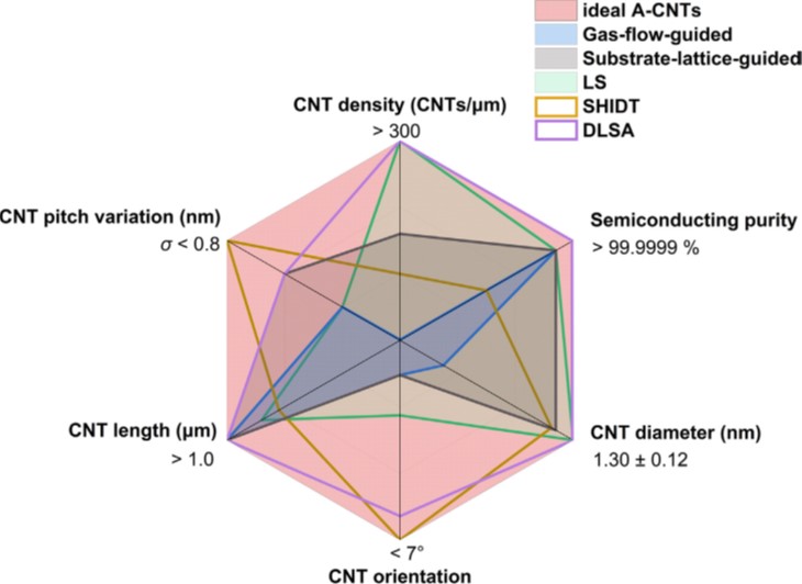 硅基商用晶体管尺寸的缩减伴随着物理极限、功耗、成本等多重挑战。新原理、新结构、新材料器件亟需引入,以满足集成电路对集成度和算力的需求。半导体型阵列碳纳米管(A-CNT)具有高载流子迁移率、超薄体、对称的能带结构,基于此材料制备出的互补金属氧化物半导体场效应晶体管(CMOS FET)展示出几乎对称的电学性能(Science 368, 850, 2020; Nature Electronics 4, 405, 2021; ACS Nano 16, 21482, 2022),90 nm节点A-CNT FET的性能超越了硅基28 nm节点器件,并展现出进一步缩减至10 nm节点的潜力(Nature Electronics 6, 506-515, 2023),是构建未来集成电路的理想器件。实现碳基集成电路技术从原型器件到工程化集成的跨越,需要晶圆级高质量的半导体碳纳米管材料。经过了30余年的发展,学术界已经发展了体系丰富的碳纳米管材料制备技术,然而,目前电子级碳纳米管材料,特别是A-CNT材料,一直缺乏具体要求和标准,在一定程度上阻碍了碳基集成电路的发展。