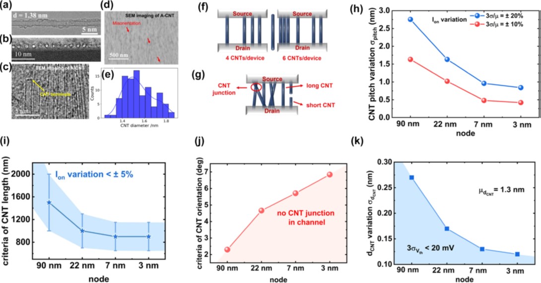 、碳基电子学研究中心张志勇教授课题组与浙江大学材料科学与工程学院金传洪教授课题组合作,从高性能电子器件和集成电路角度,对A-CNT材料进行深入研究与系统分析,提出了精细的要求和标准。通过实验结果结合理论计算,团队对90 nm、22 nm、7 nm、3 nm技术节点的A-CNT FET的电学性能进行预测,并基于未来集成电路对晶体管性能的要求,提出对阵列碳纳米管密度的要求(图1 a)。研究结果表明,相同节点下,A-CNT CMOS器件相比于硅基CMOS器件展现出4-6倍的能量延时积(EDP)优势(图1 b),凸显了其在未来高性能数字集成电路中的应用潜力。团队进一步对目前A-CNT中存在的形貌缺陷进行表征(图2 a-e),讨论各形貌缺陷对晶体管电学性能波动的影响,并结合集成电路对器件均一性的要求,对碳管形貌提出要求(图2 f-k)。在此基础上,提出了电子级A-CNT材料的标准(表1),包括碳管密度、直径、长度、半导管纯度、取向、相邻管间距变化等关键参数,并展望了未来碳基集成电路技术和材料的协同优化路线(图3),对目前学术界发展的几种典型A-CNT制备方式进行了综合评估(图4),为电子级A-CNT材料的制备技术发展提供了重要指导。