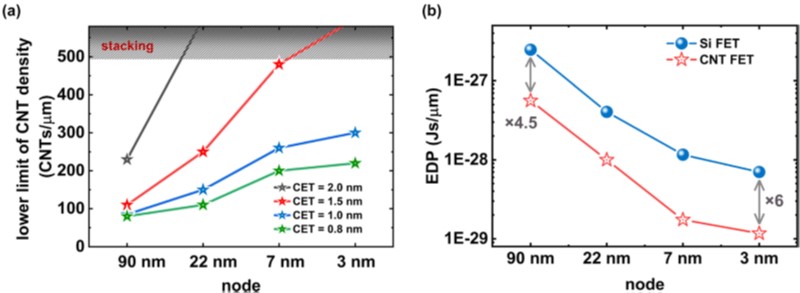 图1:阵列碳纳米管密度要求、晶体管性能对比