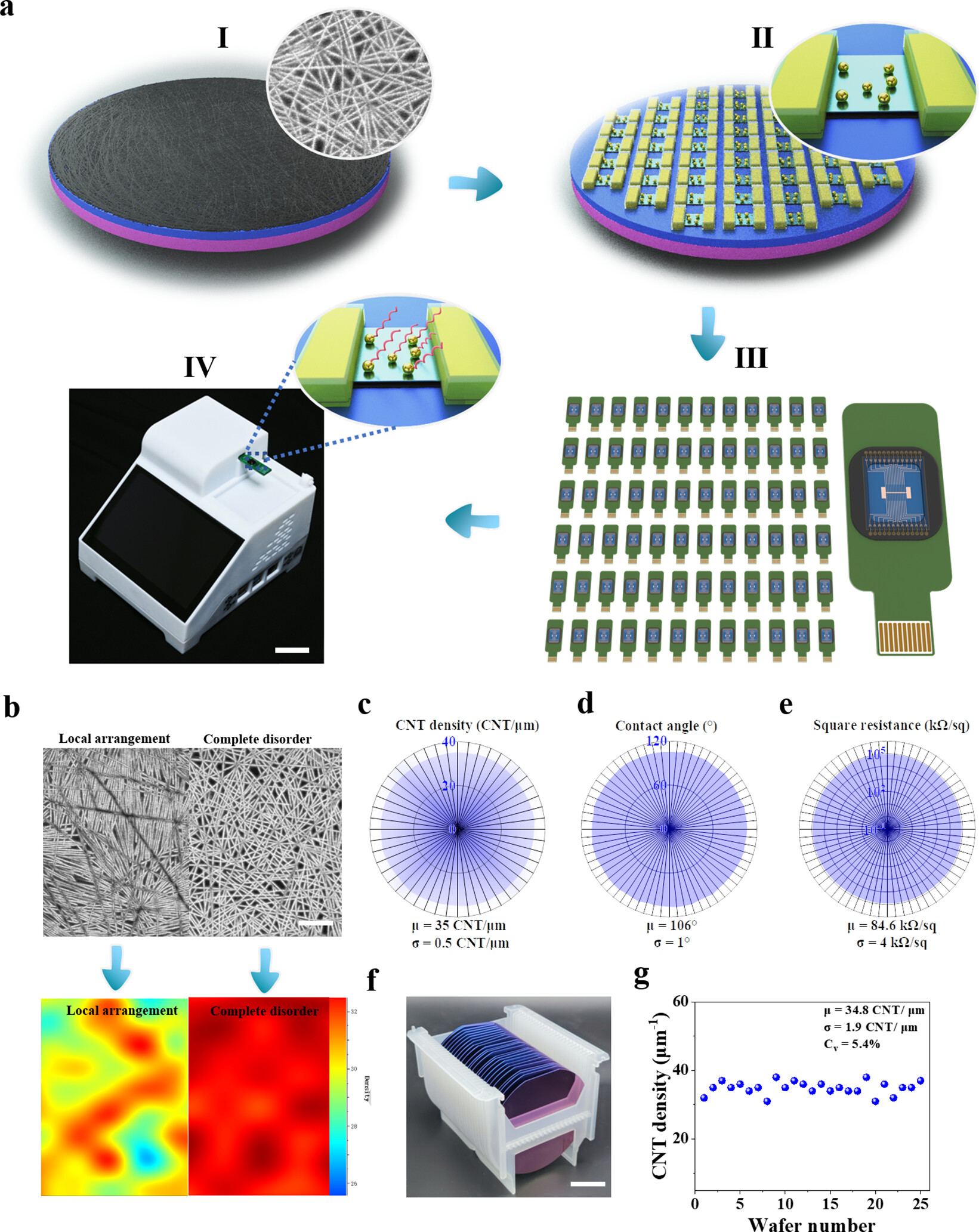 团队逐点解决CNT材料制备、生物传感器制造、芯片封装和信号读取等技术难点,打造CNT FET生物传感器的完整链技术,并为其在POCT领域的应用开发坚实的技术基础。具体而言,在材料制备上,通过改进的浸渍涂层技术制备了高质量和均匀性的随机取向半导体CNT薄膜(图1)。