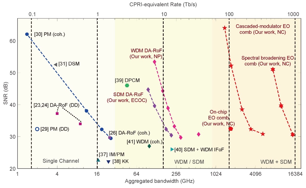 )和上海实验区(依托上海交通大学)合作完成的重要成果。近年来,联合研究团队在光载无线接入领域取得了多项重要进展。团队的前期针对单模光纤提出的克隆光梳架构发表于光学领域顶尖期刊Nature Photonics;并在光通信领域的两个国际顶级会议Optical Fiber Communication Conference (OFC)和European Conference on Optical Communication (ECOC)上遴选为Post-Deadline Paper(PDP)论文报告,PDP论文旨在发布光通信领域的最新技术进展和纪录性成果,代表着业内当前最高技术水平。