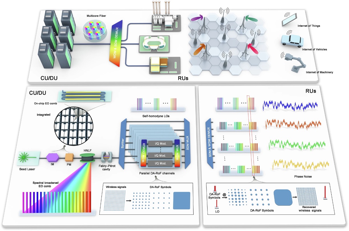 为了突破上述瓶颈,联合团队提出了基于空间-波长超级信道的多维复用接入新架构。该架构通过构建多路并行通道实现超大容量、通过数模混合接口突破前传链路的信噪比瓶颈,通过电光梳共享光源线宽特性实现低功耗自零差相干检测,通过多芯光纤共享远端本振降低射频单元侧成本,达到一举多得的目的。