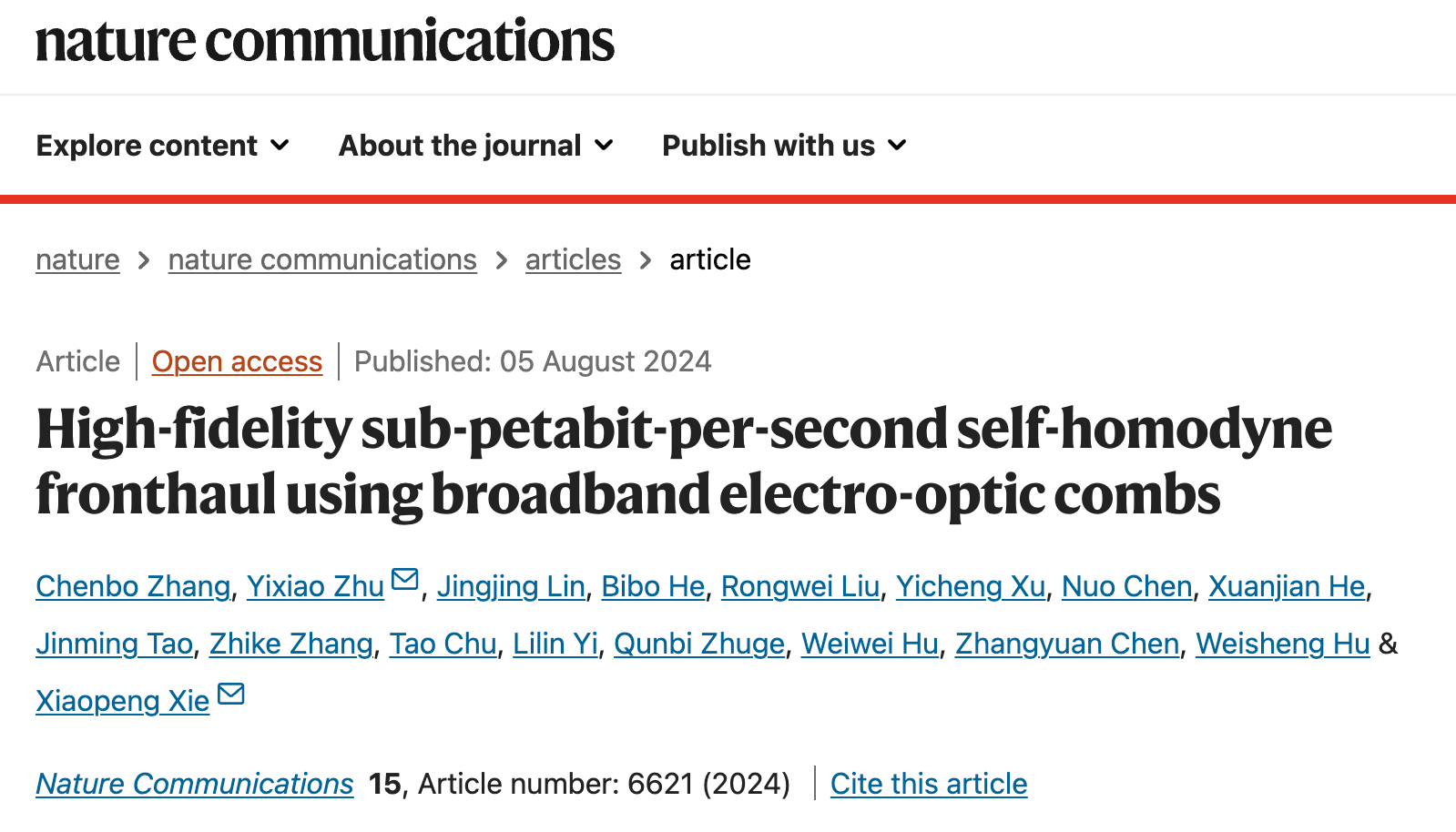 微波光子团队与上海交通大学、浙江大学、中科院半导体所、鹏城实验室等团队密切合作,面对6G时代光载无线接入网容量和信噪比受限的挑战,提出了多维复用-数字模拟混合-自零差相干前传接入架构,实现了超大容量和超高制式的无线信号前传接入。2024年8月5日,相关研究成果以“宽谱光梳赋能亚Pb/s高保真度自零差数字模拟前传”(High-fidelity sub-petabit-per-second self-homodyne fronthaul using broadband electro-optic combs)为题,在线发表于《自然·通讯》(Nature Communications)。