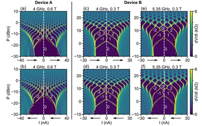 与先前理论对比——另一个有趣的地方是实验中观察到的零电压Shapiro台阶中心位置随微波辐照功率增加而移动的趋势不支持先前理论研究中常用的RSJ(resistively shunted junction)模型的计算结果。根据RSJ模型的模拟计算,零电压Shapiro台阶中心位置随着微波功率的增加应当逐渐趋近电流偏置零点,而实验观察到的则是逐渐远离零点(图2)。这说明实验中观测到的效应与先前常用的理论预言存在微观机理上的区别。理解这种区别需要进一步通过提出新的微观机理进行建模计算和相应的实验测量研究。