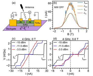 微波诱导单向超导电性——当外加偏置电流方向反转,超导系统的临界电流可能出现关于电流方向不对称的行为,这被称为超导二极管效应。该效应在构建低功耗逻辑器件以及探测奇异量子态方面具有重要应用,近年来备受关注。先前关于超导二极管效应的研究主要集中在静态条件,且完全单向超导电性的行为较为罕见。徐洪起课题组与合作者采用InAs纳米线和原位外延生长铝薄膜组成的复合结构制作了约瑟夫森结,利用微波辐照改变超导临界电流的不对称行为,实现了对超导二极管效应的调控。发现在有限磁场下,器件在没有微波辐照时表现出十分微弱的超导二极管效应(图1b绿线和红线)。但随着微波辐照的开启及其功率的增加,V-I曲线零电压Shapiro台阶的中心位置逐渐偏离偏置电流零点,最终形成一个有趣的单向超导状态,即零电压Shapiro台阶仅出现在正负偏置电流中的一个方向上,而常规有电阻态则出现在零偏置电流附近(图1d红线)。磁场角度依赖关系的测量进一步表明该现象是内禀于系统的。