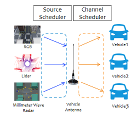 应用示例:车辆向周围车辆传输多模态感知数据,可建模为多源-多信道传输
