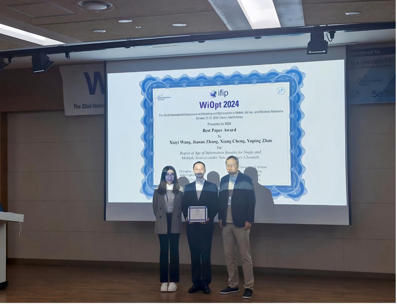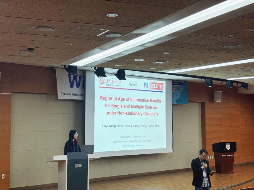 张嘉楠研究员、程翔教授团队发表题为“Regret of Age of Information Bandits for Single and Multiple Sources under Non-stationary Channels”的论文,获得最佳论文奖(Best Paper Award),也是本次会议唯一的最佳论文奖。该工作研究未知、非平稳信道下网络调度问题,通过最小化信息年龄(Age of Information, AoI),保证信息传输的时效性,设计了信息年龄近似最优的调度方案。