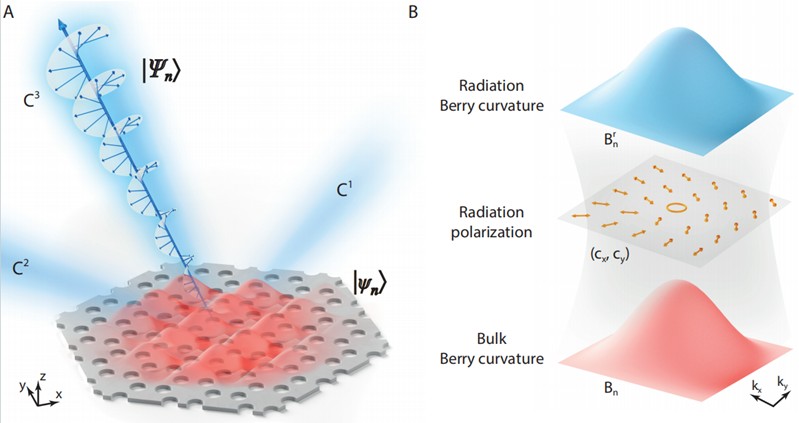 在研究中,团队利用光子晶体平板结构构造具有非平凡拓扑性质的光子能带。为解决波函数被封闭在体系内部难以直接观测的难题,团队提出利用辐射光子作为“信使”,将体系内部的能带拓扑信息投射在远场辐射的偏振信息中,成为一种直接观测开放体系拓扑性质的创新方法。团队理论上证明了光子辐射的几何特性与系统内在能带拓扑的关系,即 “辐射拓扑-能带拓扑的对应关系”(bulk-radiation correspondence)。团队发现远场辐射的偏振态作为可直接观测量,可直接反映非厄米体系光子能带的贝利曲率在二维动量空间中的分布。由此,团队构建了一个光学测量系统,对蜂窝晶格光子晶体平板中的贝利曲率以及谷-陈数进行了直接测量。