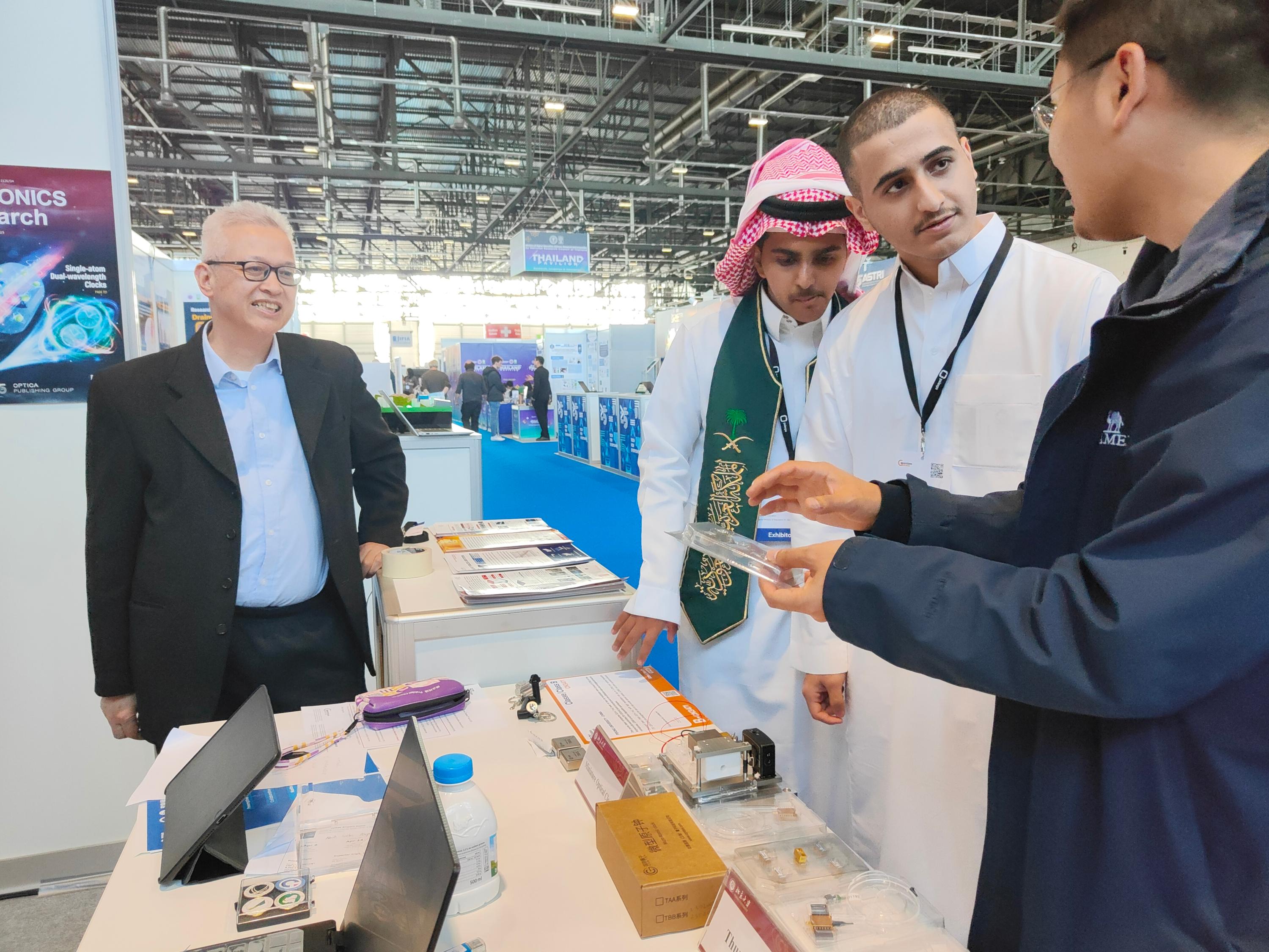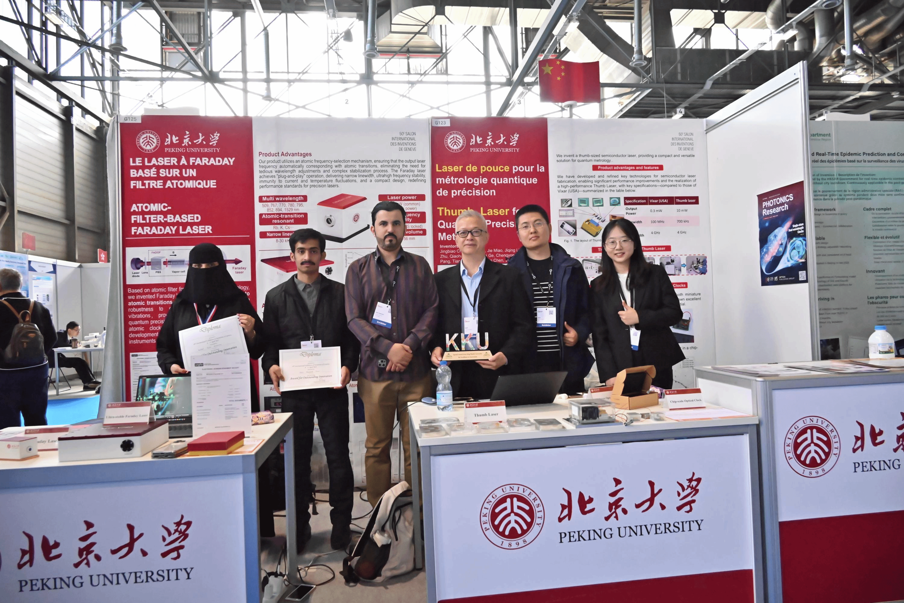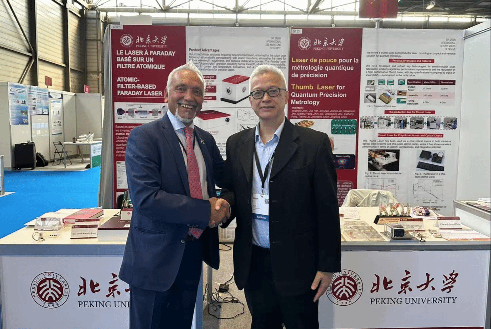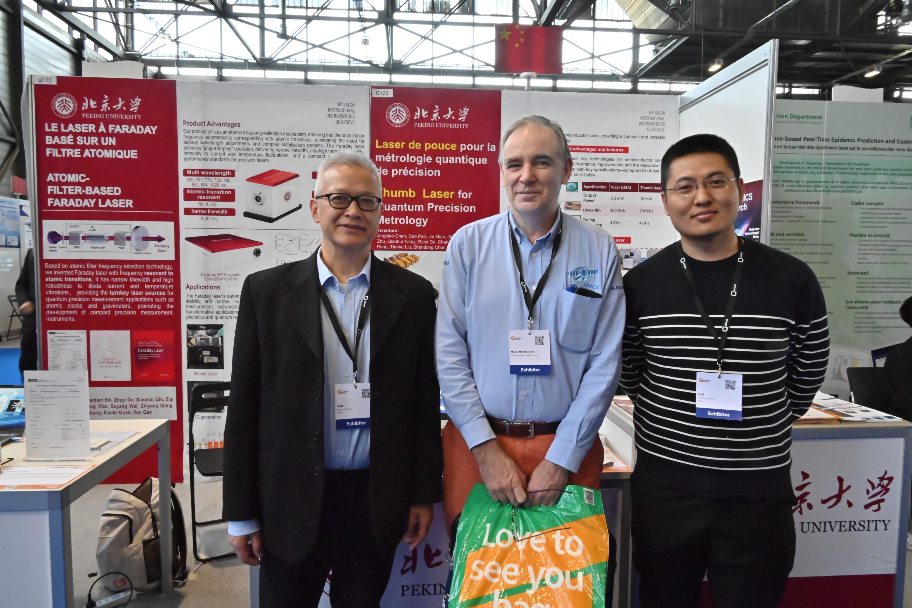 在此次日内瓦国际发明展上,陈景标教授及博士研究生秦晓敏、苗杰,热情地向参观者介绍成果,受到瑞士、沙特阿拉伯、俄罗斯、泰国等各国家与会人员的广泛关注和高度评价。经评审,陈景标教授团队研发的“原子选频激光器”和“大拇指激光器”两项创新成果从全球上千件参展项目中脱颖而出,荣获金奖。这两项金奖成果展现了中国团队在激光稳频技术上的突破性创新,为助力实现我国量子精密测量领域高水平科技自立自强提供了有力支撑。