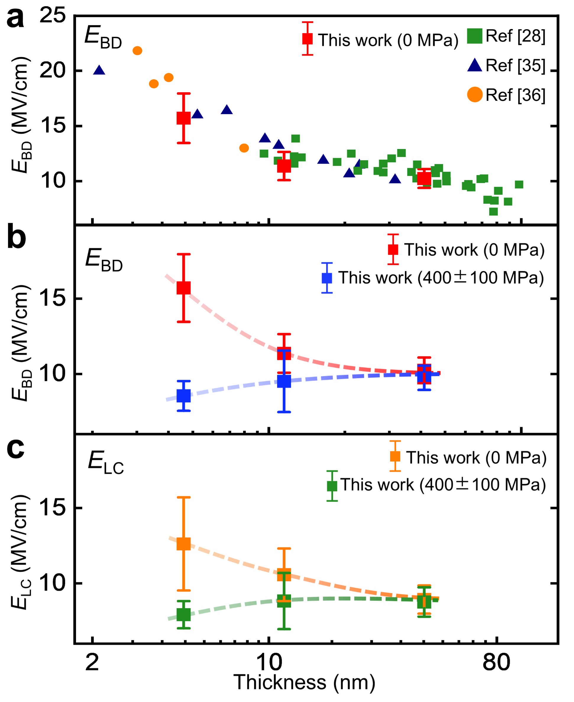 图1 不同应力情况下不同厚度二维hBN的本征击穿电场强度(EBD)和出现显著漏电流的电场强度(ELC)