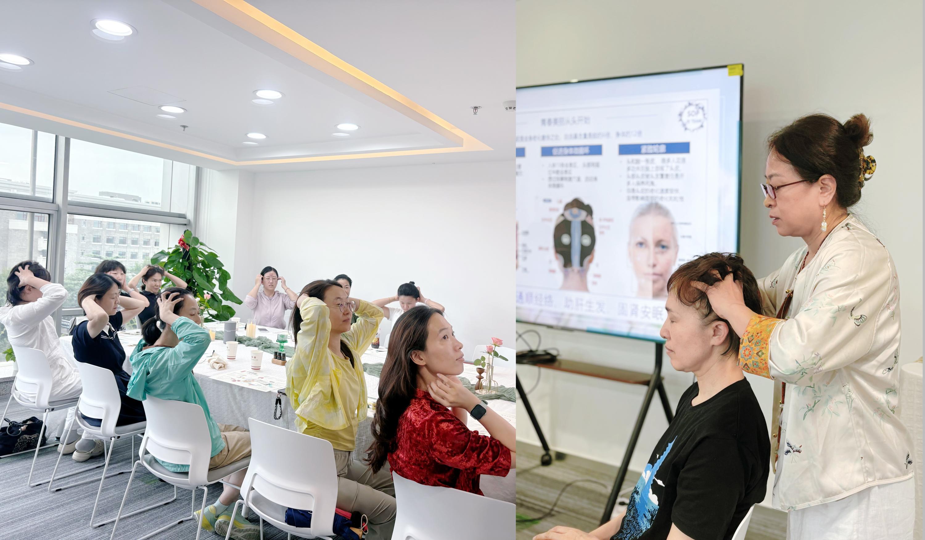 在按摩环节,老师演示了多种技法,将调配好的精油轻柔涂抹于相应部位,以指腹轻轻按摩鼻翼两侧促进血液循环,每个部位按摩3-5分钟。具体指导了头部、肩部、胸部、腹部及两肋的按摩手法,老师们认真练习,场面温馨活跃。老师们重点学习了按摩太阳穴、风池穴和百会穴的手法,以调节头部气血运行。讲师特别为胡老师进行头部按摩,胡老师欣喜表示:“顿觉神清气爽,对保持下午的工作精力大有裨益。
