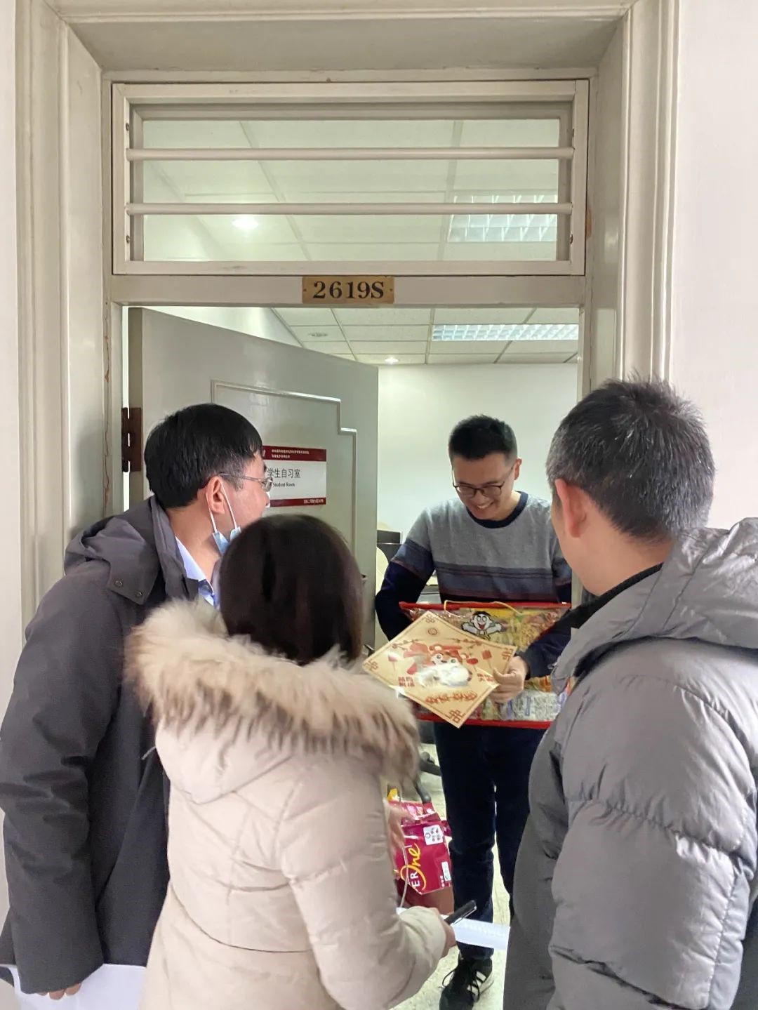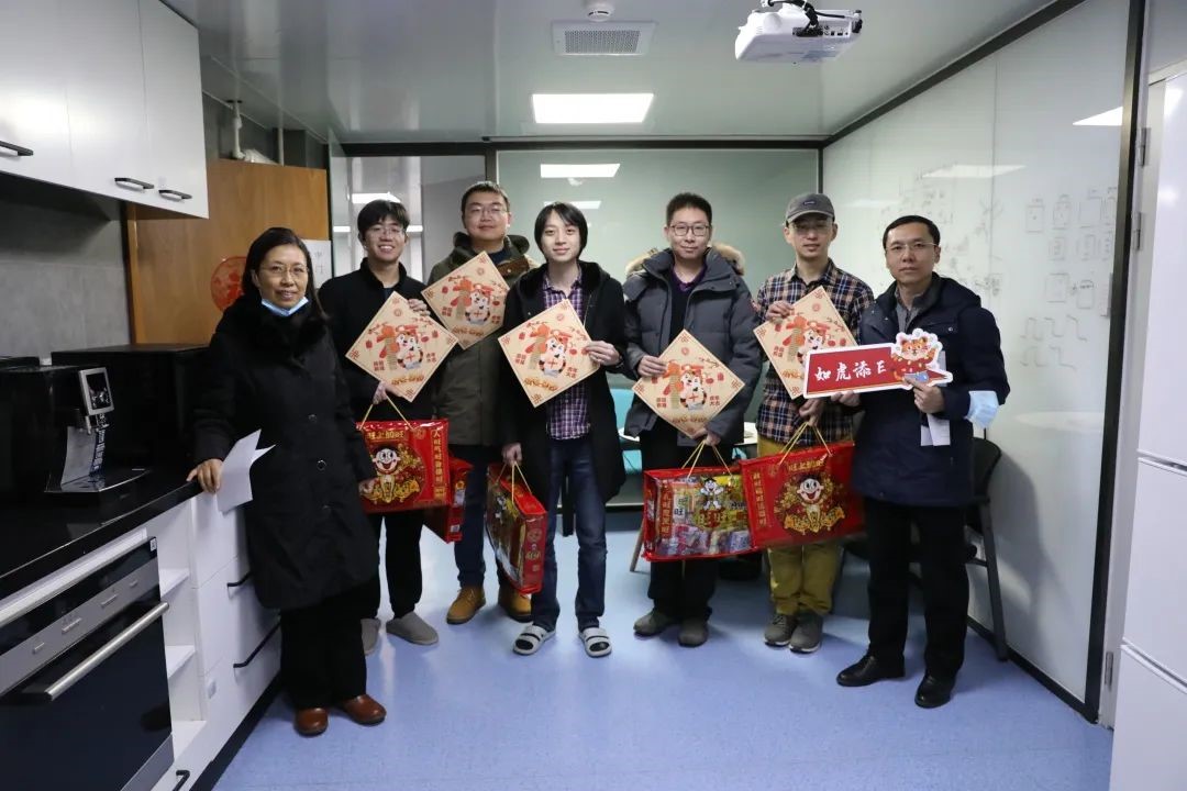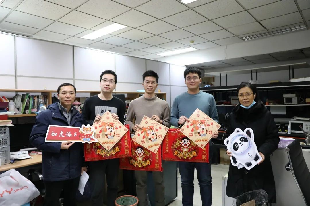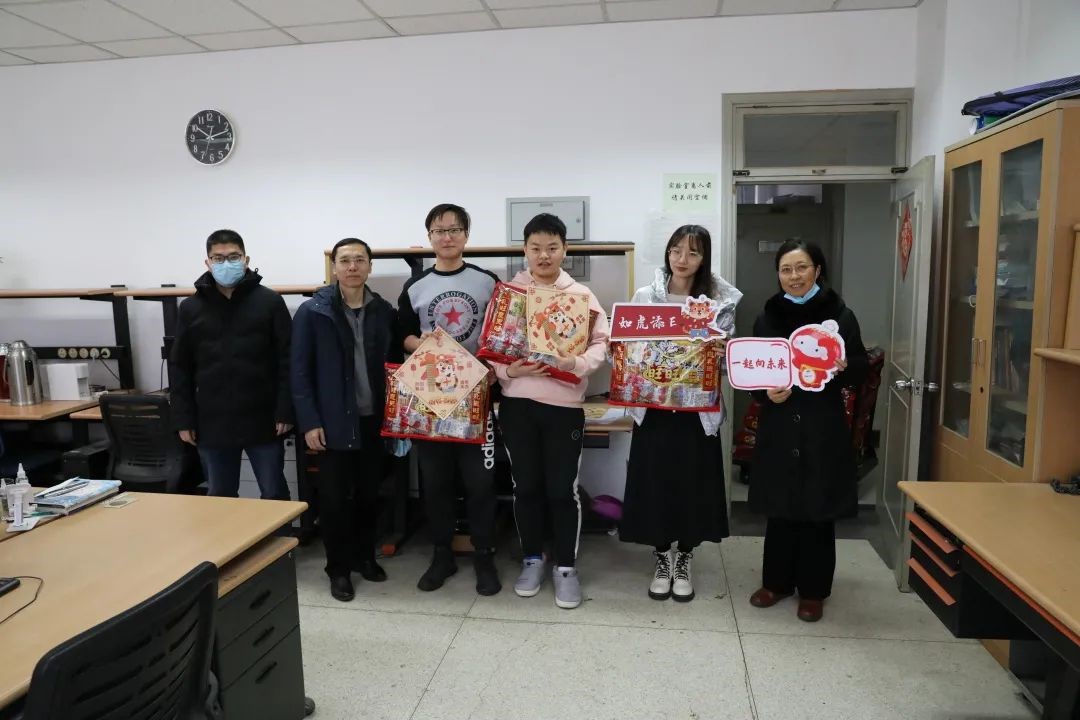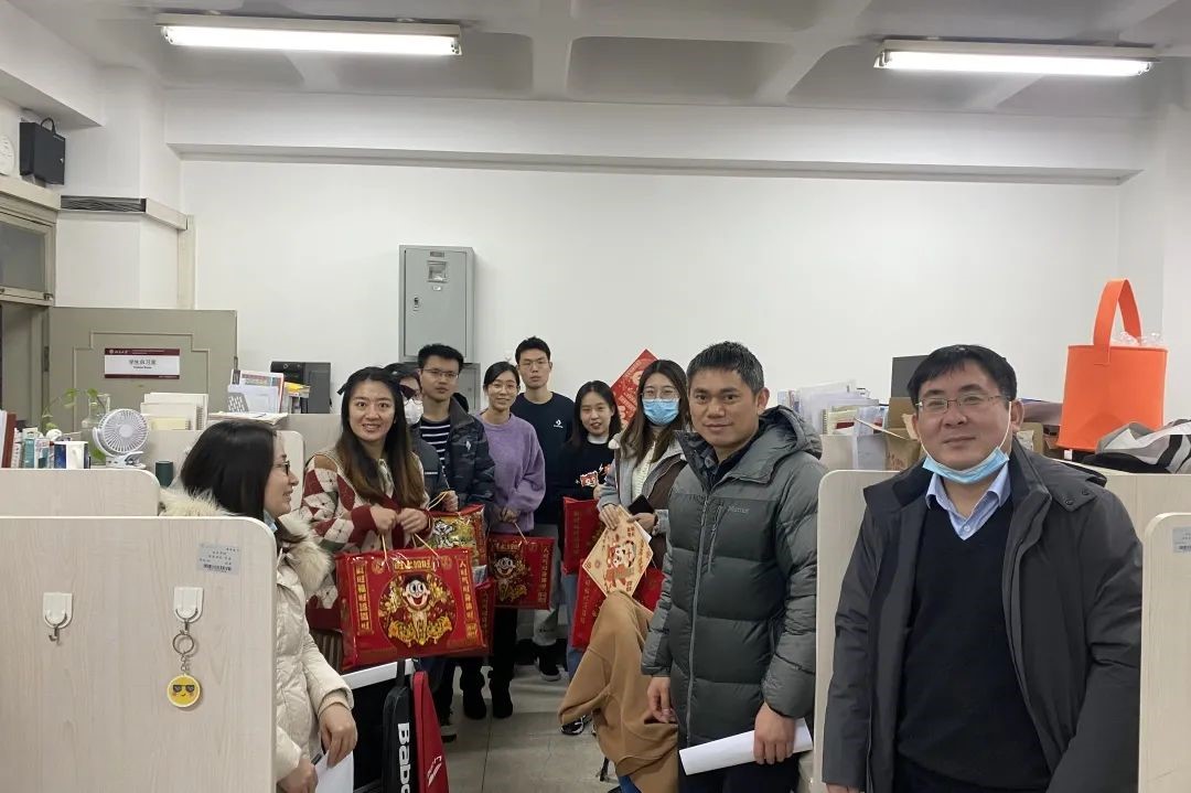 领导和老师带着新春大礼包探访留校过年的同学们,为大家送去满满的关心与祝福。学院党委书记冯梅萍,党委副书记王一涵,副系主任王兴军、王延辉,学院教师魏贤龙,以及在校学生骨干、热心学生党员一同走访学生办公室、实验室,将燕园“福”字和零食大礼包一一送到了留校同学手中。