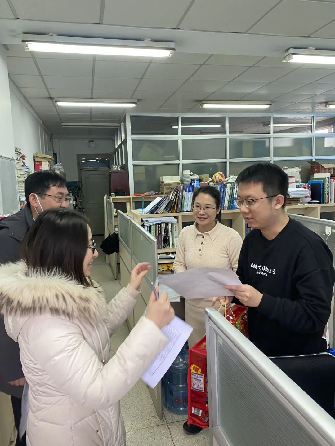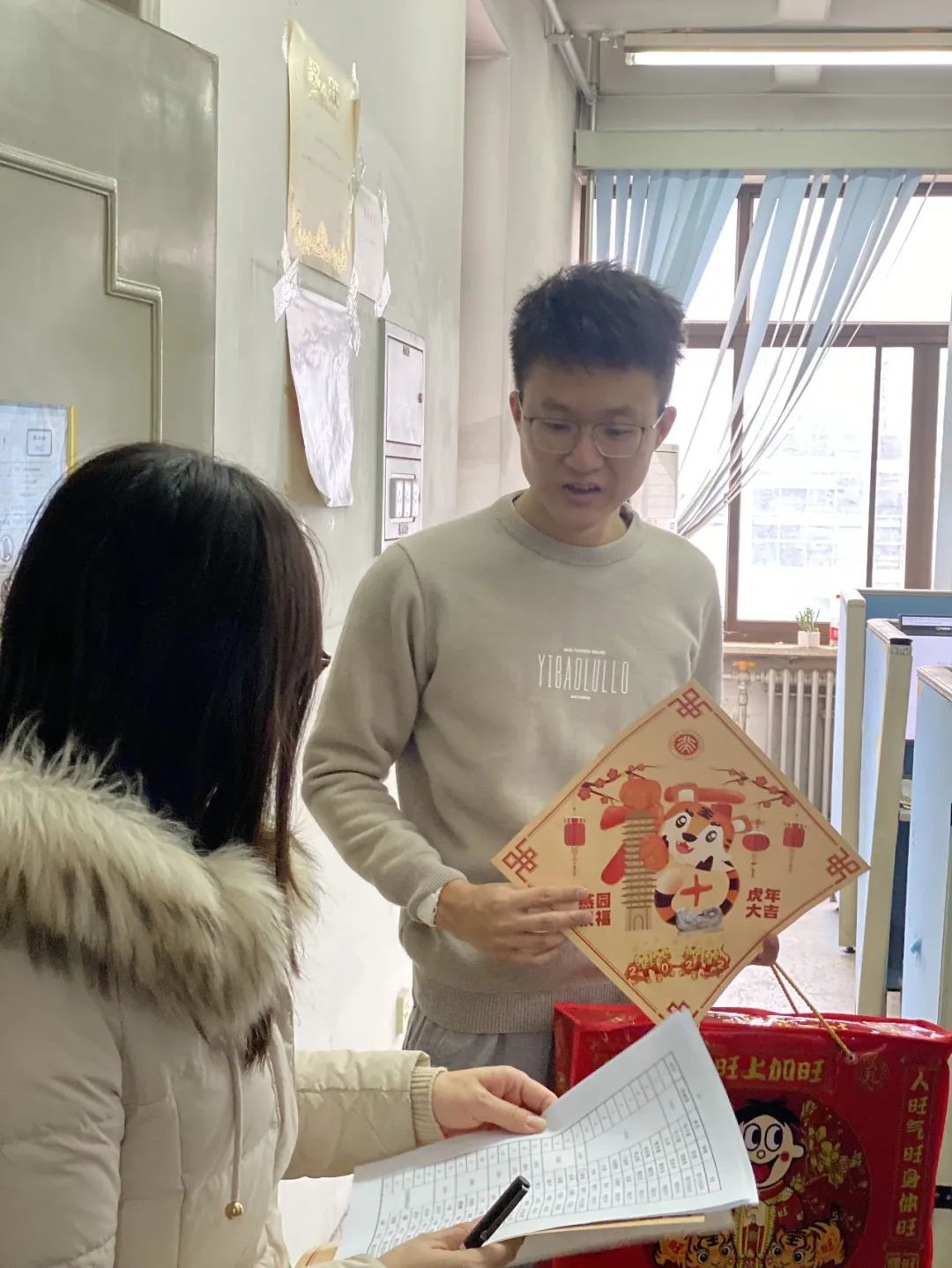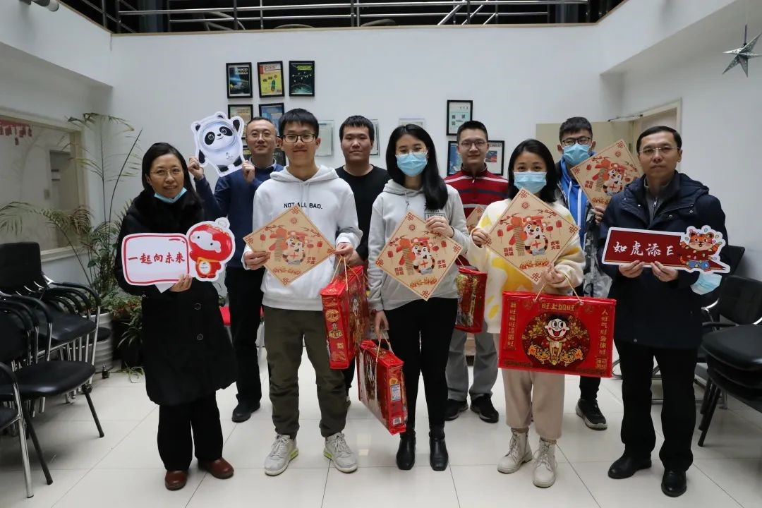 领导和老师带着新春大礼包探访留校过年的同学们,为大家送去满满的关心与祝福。学院党委书记冯梅萍,党委副书记王一涵,副系主任王兴军、王延辉,学院教师魏贤龙,以及在校学生骨干、热心学生党员一同走访学生办公室、实验室,将燕园“福”字和零食大礼包一一送到了留校同学手中。