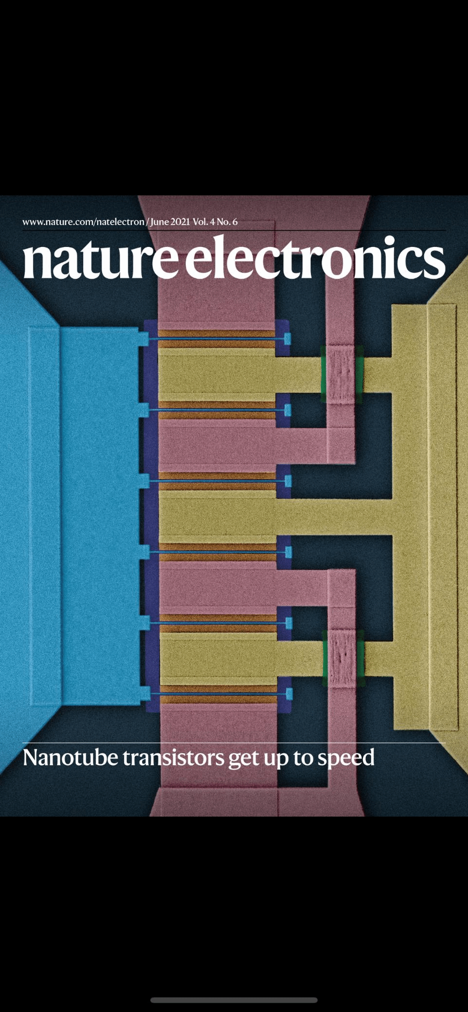 该工作首次将碳纳米管射频器件的工作带宽提升至了太赫兹领域,真正展示了碳纳米管器件的高速和高带宽优势。2021年6月21日,相关研究成果以《基于阵列碳纳米管的射频晶体管器件》(Radiofrequency transistors based on aligned carbon nanotube arrays)为题,在线发表于《自然·电子学》(Nature Electronics),并被选为封面文章(见图六);成人影片