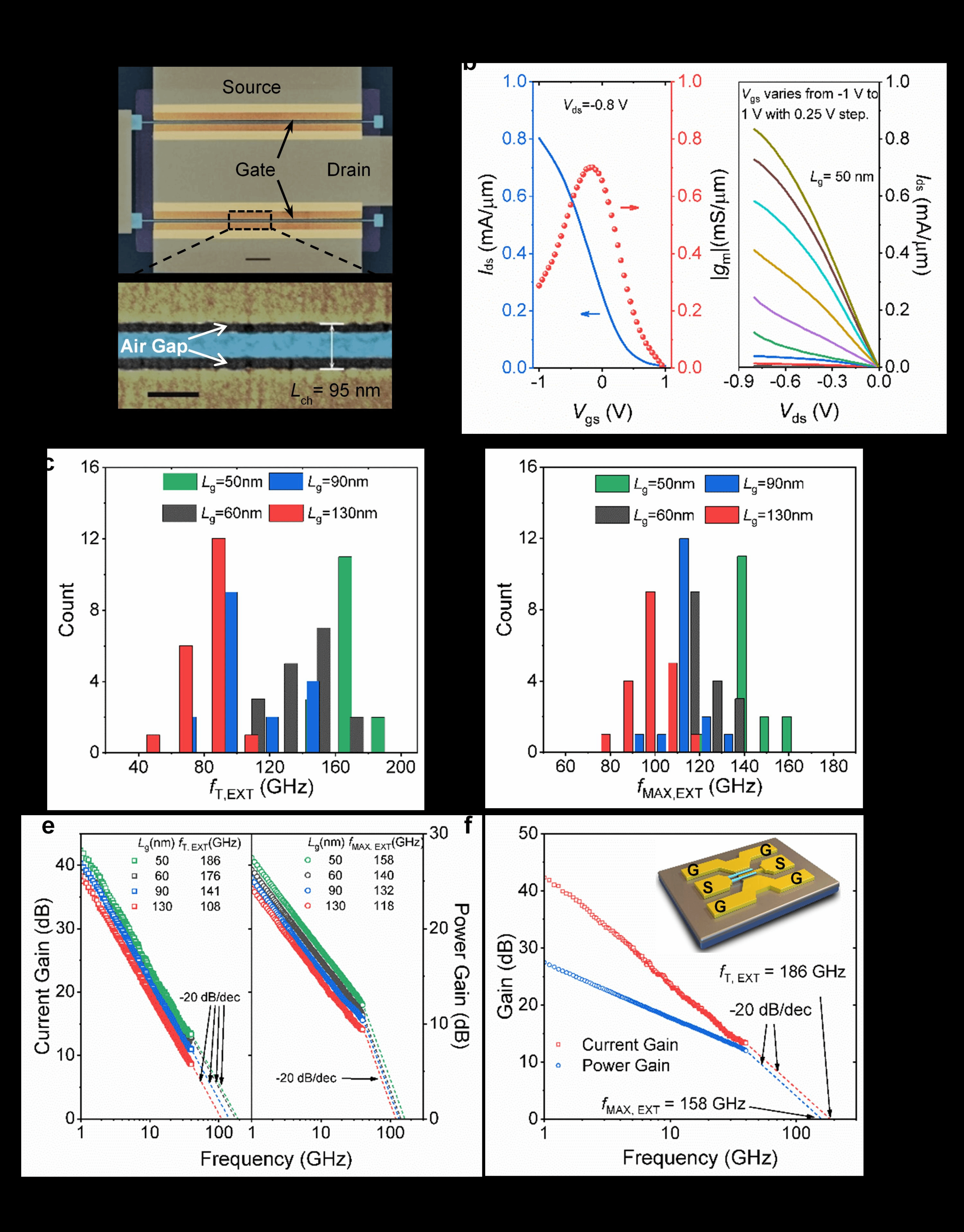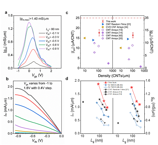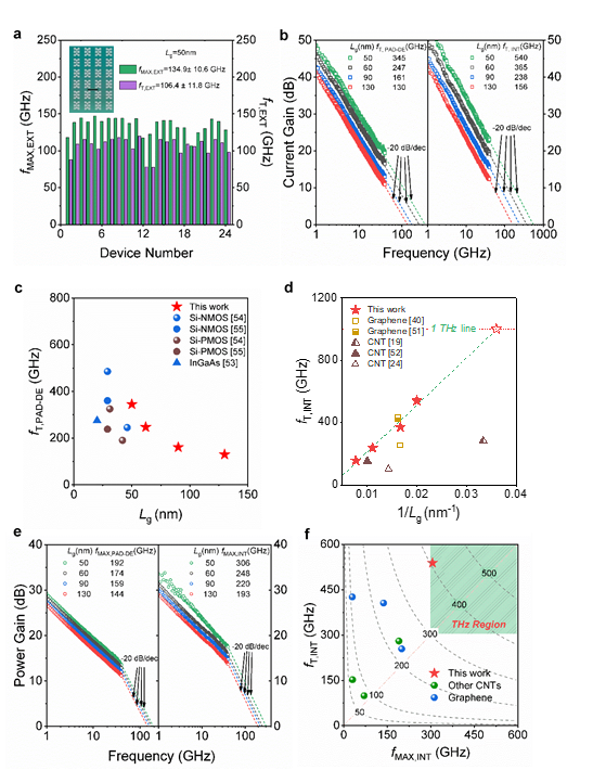电子系碳基电子学研究中心、纳米器件物理与化学教育部重点实验室张志勇教授-彭练矛教授联合课题组通过改进提纯和双液相自组装沉积方法,制备了适合射频应用的半导体阵列碳纳米管材料,并在此基础上首次实现了有望在太赫兹频段工作的射频晶体管和高性能放大器,充分展现了碳管在射频电子学上的优势和潜力。联合课题组针对射频的大规模应用优化了材料制备,采用烷基链较少的PCO-Bpy分子经两次分散提纯和双液相自组装沉积工艺,在4英寸晶圆上实现了高半导体型纯度(>99.99%)、高取向和高密度(100~120根/微米)的碳管阵列的制备,载流子迁移率最高达1580 cm2V-1s-1(见图一)。课题组在全绝缘的石英衬底上制备了阵列碳纳米管射频晶体管,其中50 nm栅长器件的实测截止频率(fT,EXT)和功率增益截止频率(fMAX,EXT)分别达到了186 GHz和158 GHz,是所有基于纳米材料晶体管的最高值(见图二)。高阻硅衬底的晶体管展示出最高达1.9 mA/µm的开态电流和1.4 mS/µm的跨导(Vds=-0.9V时,见图三),50 nm栅长射频晶体管的本征截止频率(fT,INT)和功率增益截止频率(fMAX,INT)分别为540 GHz和306 GHz,这表明碳基射频器件首次进入到了太赫兹频段(见图四)。课题组进一步探索了碳基射频晶体管在射频放大器中的应用潜力,通过采用多指栅结构提升碳基晶体管的负载驱动能力,实现了碳基放大器在功率增益和线性度上的提升,首次在18 GHz(K波段)实现了高达23.2 dB的增益,线性度测试中实现了> 9 dBm的1 dB压缩点输,出功率和OIP3=31.2 dBm的三阶交调特性,对应的OIP3/Pdc为19.7 dB@18 GHz(见图五),各项关键指标均远高于之前美国南加州大学报道的最好碳基放大器。