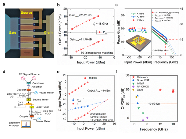 图五 碳纳米管射频放大器的功率增益和线性度表征