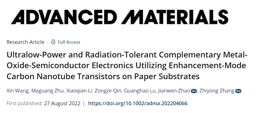 相关成果以题为《利用纸基增强型碳纳米管晶体管制备的超低功耗和抗辐照互补金属氧化物半导体电子器件》(Ultralow-power and radiation-tolerant complementary metal-oxide-semiconductor electronics utilizing enhancement-mode carbon nanotube transistors on paper substrates)的论文,于8月27日在线发表于《先进材料》(Adv.Mater.2022, 2204066),中国科学院苏州纳米所王欣与成人影片 朱马光博士为共同第一作者,成人影片 张志勇教授与中国科学院苏州纳米所赵建文研究员为共同通讯作者。
