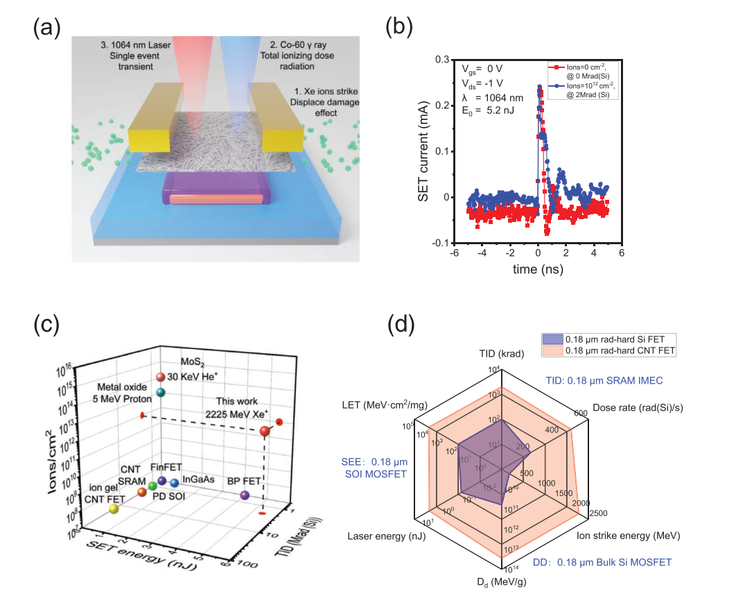 碳基电子学研究中心、纳米器件物理与化学重点实验室张志勇课题组与中科院微电子所李博研究员、中科院国家空间科学中心陈睿副研究员合作,基于碳纳米管晶体管和静态随机存储器单元,利用激光辐照源测试碳基集成电路抗单粒子辐照能力,利用重离子辐照源测试碳基集成电路抗位移损伤能力,利用Co-60伽马射线源测试碳基集成电路抗电离总剂量辐照能力,系统揭示了碳纳米管场效应晶体管中的总剂量辐照、单粒子和位移损伤三种辐照损伤机理,探索了碳纳米管电子器件综合抗辐照效应能力。实验结果显示,所构建的碳纳米管晶体管和静态随机存储器电路可承受104MeV cm2mg-1等效激光单粒子辐照,2.8×1013MeV g-1的位移损伤辐照以及2 Mrad(Si)的电离总剂量辐照,其综合抗辐照能力优于硅基器件四倍以上,充分展示了碳纳米管电子器件在抗辐照领域的应用潜力。