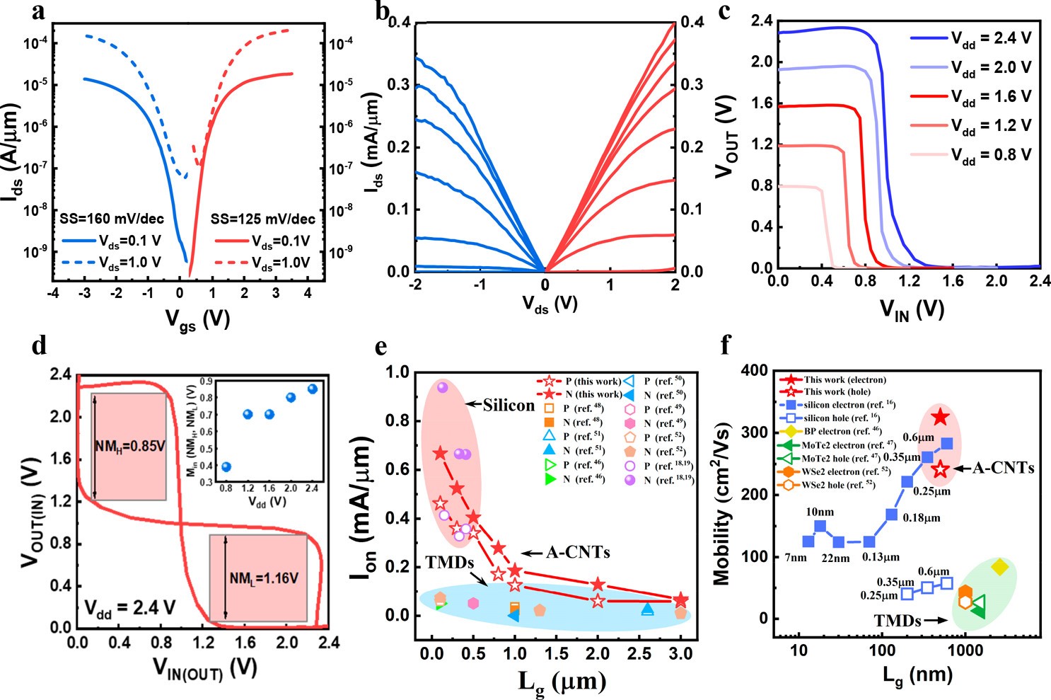 、碳基电子学研究中心、纳米器件物理与化学教育部重点实验室张志勇教授课题组对基于阵列碳管的N型晶体管深入进行研究,发现器件性能和成功率不高的根本原因在于以低功函数作为接触的N型晶体管在金属-碳管界面处的氧化(图1)。团队开发出衬底疏水性处理和降低阵列碳管的密度(图2a-b)两种方法,有效解决了金属-碳管界面处的氧化问题,制备出高性能N型晶体管。典型300nm栅长的晶体管饱和电流和峰值跨导分别达到600mA/mm和225mS/mm(图2c-f),归一化性能相比于此前报道的碳管N型晶体管提升了1-2个量级,展示了良好的长期稳定性。在此基础上,团队开发了基于阵列碳管的高性能CMOS器件与电路工艺(图3)。500nm栅长的CMOS晶体管展示出几乎对称的性能,开态电流可达400mA/mm(图4)。基于阵列碳管的CMOS器件电子与空穴的迁移率分别为325和241cm2V-1s-1,高于同尺寸硅基和二维过渡金属硫化物(TMDs)制备的CMOS器件(图5),充分展示了碳纳米管电子器件在高性能CMOS电子领域的应用潜力。