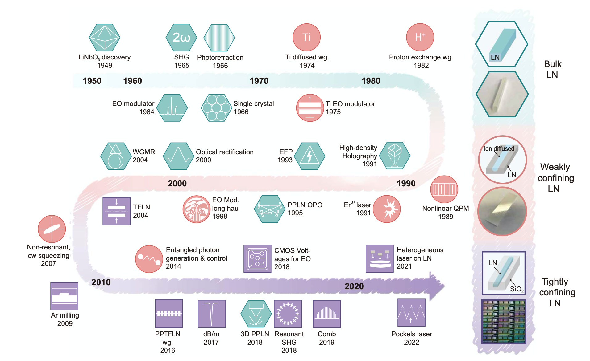 铌酸锂是一种关键的光子材料。由于其材料本身的大电光、压电和非线性效应的特性,以及具有商业上普遍供应的光学质量晶圆的优势,非常适合被用于产生和控制各种频段的电磁波。几十年来,共出现了三种LN光子平台,分别为块状晶体、弱约束波导和紧密约束波导,其演变过程见图1。
