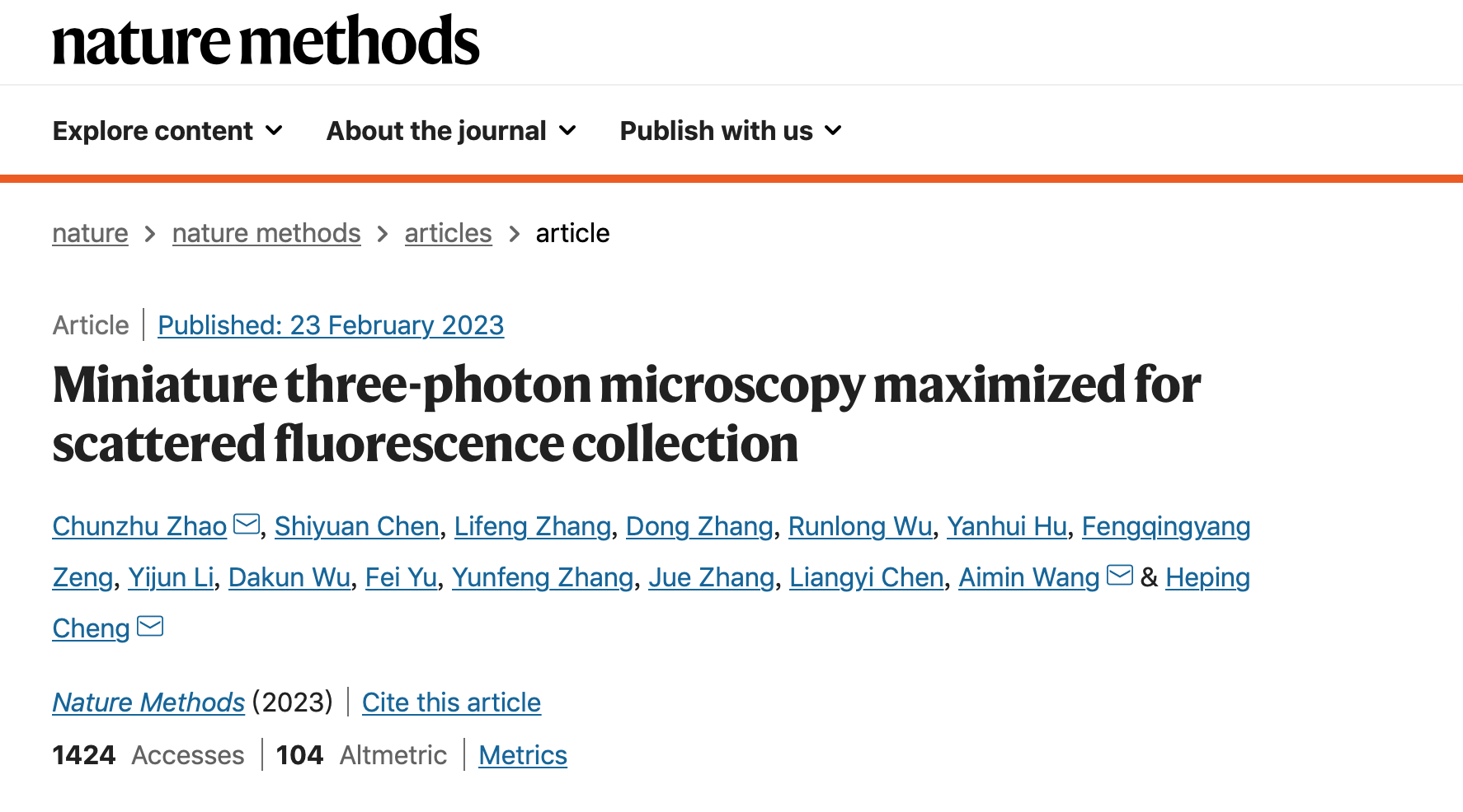 王爱民课题组在Nature Methods在线发表文章“Miniature three-photon microscopy maximized for scattered fluorescence collection”。文中报道了重量仅为2.17克的微型化三光子显微镜(图1),首次实现对自由行为小鼠的大脑全皮层和海马神经元功能成像,为揭示大脑深部结构中的神经机制开启了新的研究范式。