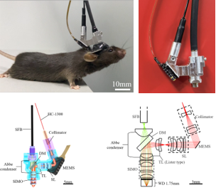 海马体位于皮层和胼胝体下面,在短期记忆到长期记忆的巩固、空间记忆和情绪编码等方面起重要作用。啮齿类动物海马距离脑表面深度大于一个毫米。由于大脑组织,特别是胼胝体,具有对光高散射光学特性,所以,突破成像深度极限是神经科学家面临的巨大挑战。此次微型化三光子显微镜成像深度获得重大突破,主要得益于全新的光学构型带来的成倍提升的荧光收集效率。引入的微型阿贝聚光镜与简化的无限远物镜密接可以提高散射光的通透效率。同时,阿贝聚光镜与激发光路中的微型管镜部分复用,进一步简化结构及降低损耗。